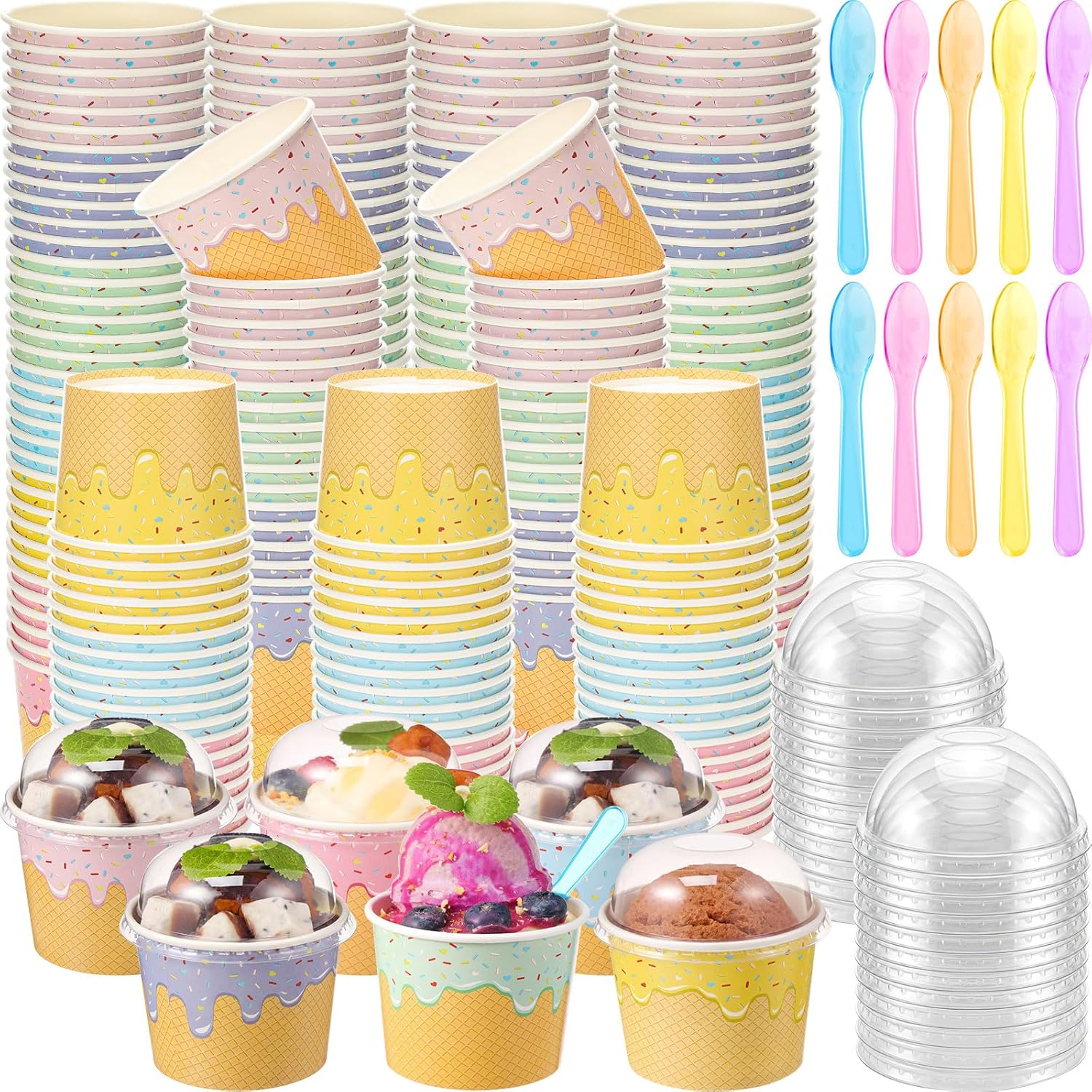Features: Space-Saving storage: These disposable ice cream bowls are designed to stack neatly, minimizing cabinet or storage space occupation. The compact stackable design allows easy organization at home, in cafe, or for event prep. No more cluttered storage-keep your supplies tidy while maintaining quick access to the ice cream party supplies whenever you need them. Safe and non-toxic: Elevate your dessert experience with our all-in-one ice cream cup set-where fun design meets practicality. Whether you're hosting a birthday party, building a home sundae bar, or serving up daily treats, this 120 set has everything you need to make every bite memorable. Specifications: Main materials: paper, plastic Main color: multicolor Size: 3.74 x 3.15 x 2.09 inches/ 9.5 x 8 x 5.3 cm(8oz) Package includes: 120 x Paper ice cream cup 120 x Lids 200 x Spoons Notes: Manual measurement, please allow slight errors on size. The color may exist a slight difference due to different screen displays