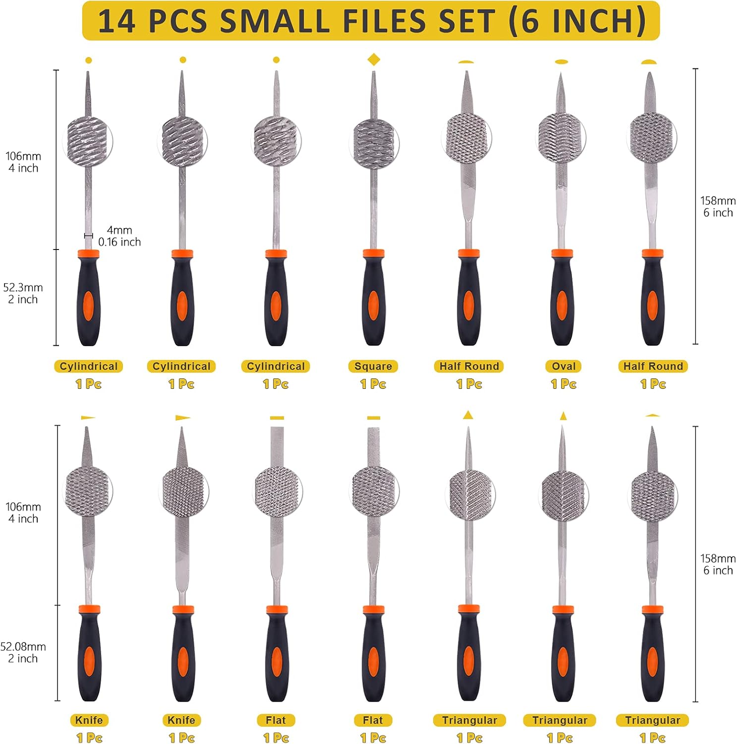▶ Mardatt 24Pcs Professional Metal File Set Tools Specification: ●Material of Files: T12 carbon steel and GCR15 bearing steel ●Material of Handle: ABS plastic and rubber ●Size: Please see the 2nd picture for size details. Our Advantages: ●Nice Variety of Metal Files and Rasp: A more practical assortment kit, including 4 large files, 14mprecision needle files. Meet your various projects’ demands. ●Wire Brush for Cleaning: Crafted with tightly held steel wire without shedding, it can extend the life of the file, easy to remove. ●Commonly used for surface treatment of metal, wood, ceramics, plastic, glass, 3-D models ect. Suitable for home, garage, workshop and more. SIX Major Functions of Different Shapes 📌Round --- Suitable for filing small holes and concave surfaces, good for de-burring, enlarging or smoothing. 📌Half-Round --- Suitable for filing large holes and concave surfaces, good for de-burring, enlarging or smoothing. 📌Rectangular --- Suitable for filing corners and slots to create a flat surfaces. 📌Triangular --- With 3-sided filing surfaces, good for acute angles less than 90 degrees. 📌Square --- With 4-sided filing surfaces, good for filing slots, grooves, and corners. 📌Thin Tapered --- Allows for getting into tight spaces on delicate and intricate work for precision filing. Package Includes: 4 x Large Metal Files Set: Round | Half Round | Rectangular | Triangular 14 x Precision Needle Files Set: Tapered Round| Tapered Half-Round | Oval | Rectangular | Tapered Rectangular | Triangular | Square 1 x Rasp File 1 x Wire Brush 4 x Sandpapers 1 x Zipper Case ❤Warm Tips: -These are pointed items, please always keep away from children.