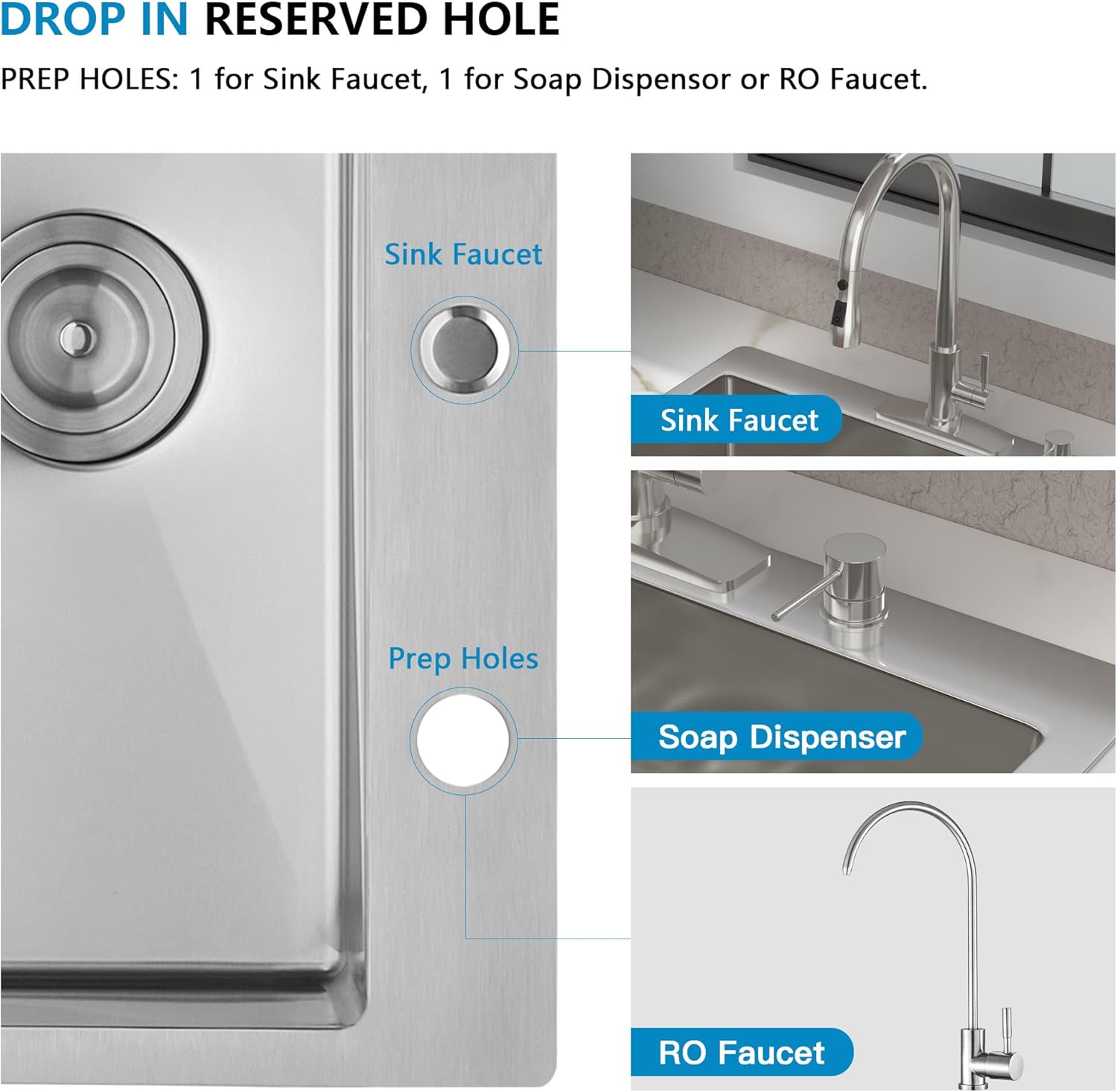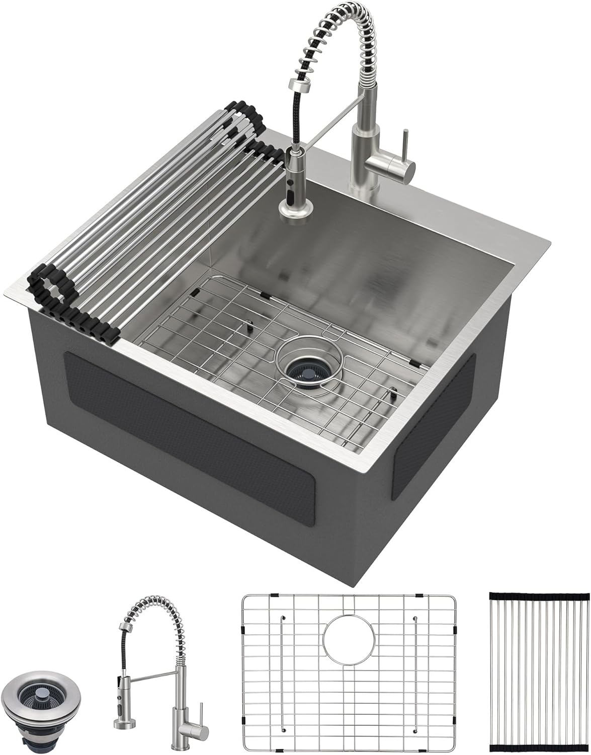 | Included Components | 25 inch drop kitchen sink, bottom rinse grid, drain assembly with cover, roll up drying rack |