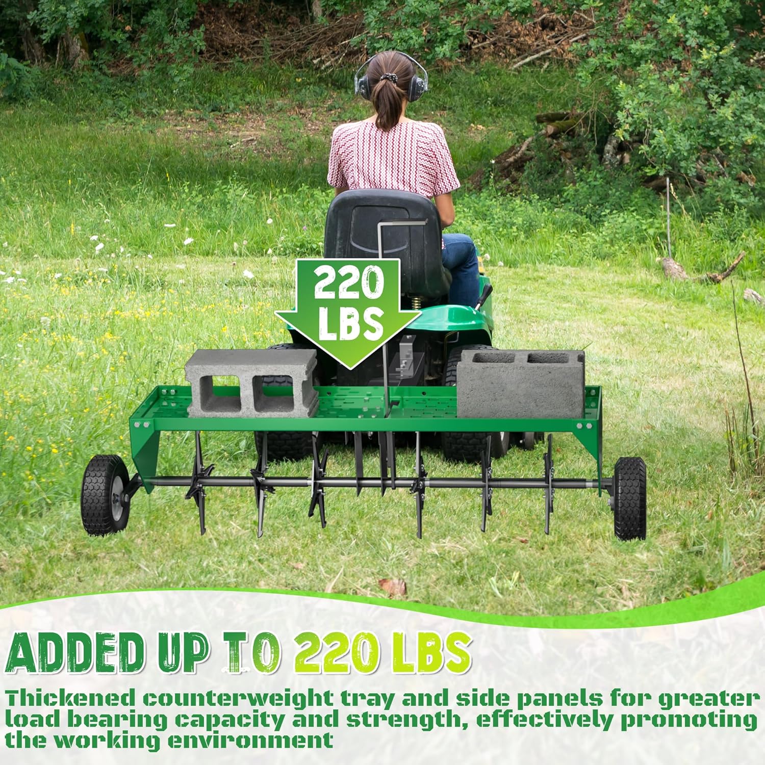 The 40-Inch Green Tow-Behind Dethatcher and Aerator form an essential lawn care duo designed for large yard maintenance, farms, and gardens.The 40-Inch Tow-Behind Dethatcher features 20 spring steel tines, specifically designed to remove thatch, leaves, and pine needles, promoting better water, air, and nutrient absorption in your lawn. With its wide 40-inch working width, it efficiently covers large areas, and the universal hitch allows it to attach easily to most lawn tractors or ATVs, making yard care faster and more efficient. Complementing the dethatcher, the PPOLB 40" Tow-Behind Plug Aerator helps aerate the soil by pulling small plugs out of the ground, reducing compaction and allowing for deeper root growth. Its durable green-painted galvanized steel construction ensures longevity, while the integrated tray allows for additional weight to increase plug depth. Inflatable wheels provide smooth operation over uneven terrain, and the universal hitch fits most towing vehicles, making it an ideal tool for large gardens, farms, and lawns Together, these tools offer a comprehensive solution for maintaining healthy, thriving lawns by improving soil health and removing unwanted debris.