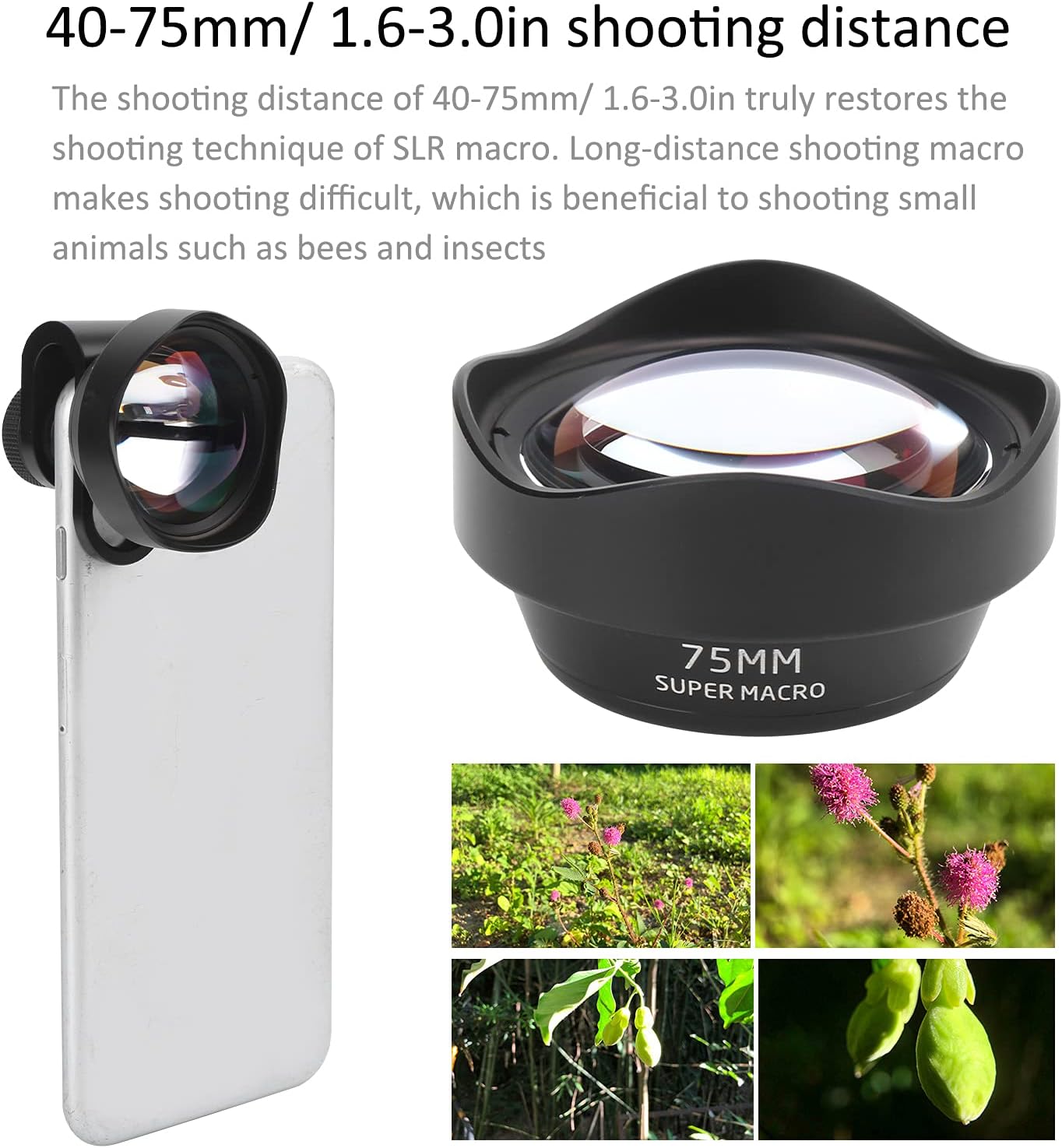 Specification: Item Type: Mobile Phone Macro Lens Material: Aluminum Alloy + Optical Glass Product Color: Black Diameter (Maximum Diameter) : Approx. 46mm / 1.8in Product Weight: Approx. 252g / 8.9oz Structure: 5 elements in 4 groups Magnification: 10 times Deformation: -1% Close Focus Distance: 40-75mm/ 1.6-3.0in Coating (AR Coating): Multilayer Interface: M14 X P0.75 How to Use: 1. Align the lens clamp with the center of the phone lens. The lens clamp has two center points aligned with the lens. 2. Find the center point of the mobile phone lens, and then turn clockwise to tighten the lens clamp nut, and tighten the lens clamp on the mobile phone to use. Package List: 1 x Lens 1 x Storage Bag 1 x Wiper Cloth 1 x Manual 1 x U-Shaped Clip 1 x Lens Note: 1. Pay attention to dust prevention. Do not touch the glass lens with your fingers or other objects. Dust or foreign objects stuck to or inside the lens will affect the effect. After use, remember to put on the protective cover and put it in the storage bag. 2. It is the same as digital products that can not enter water, after entering water, it is easy to form fog, which will make the blurry and unusable. 3. Prevent falls. The built‑in lens is made of high light material, and it is likely to break when dropped on a hard object.
