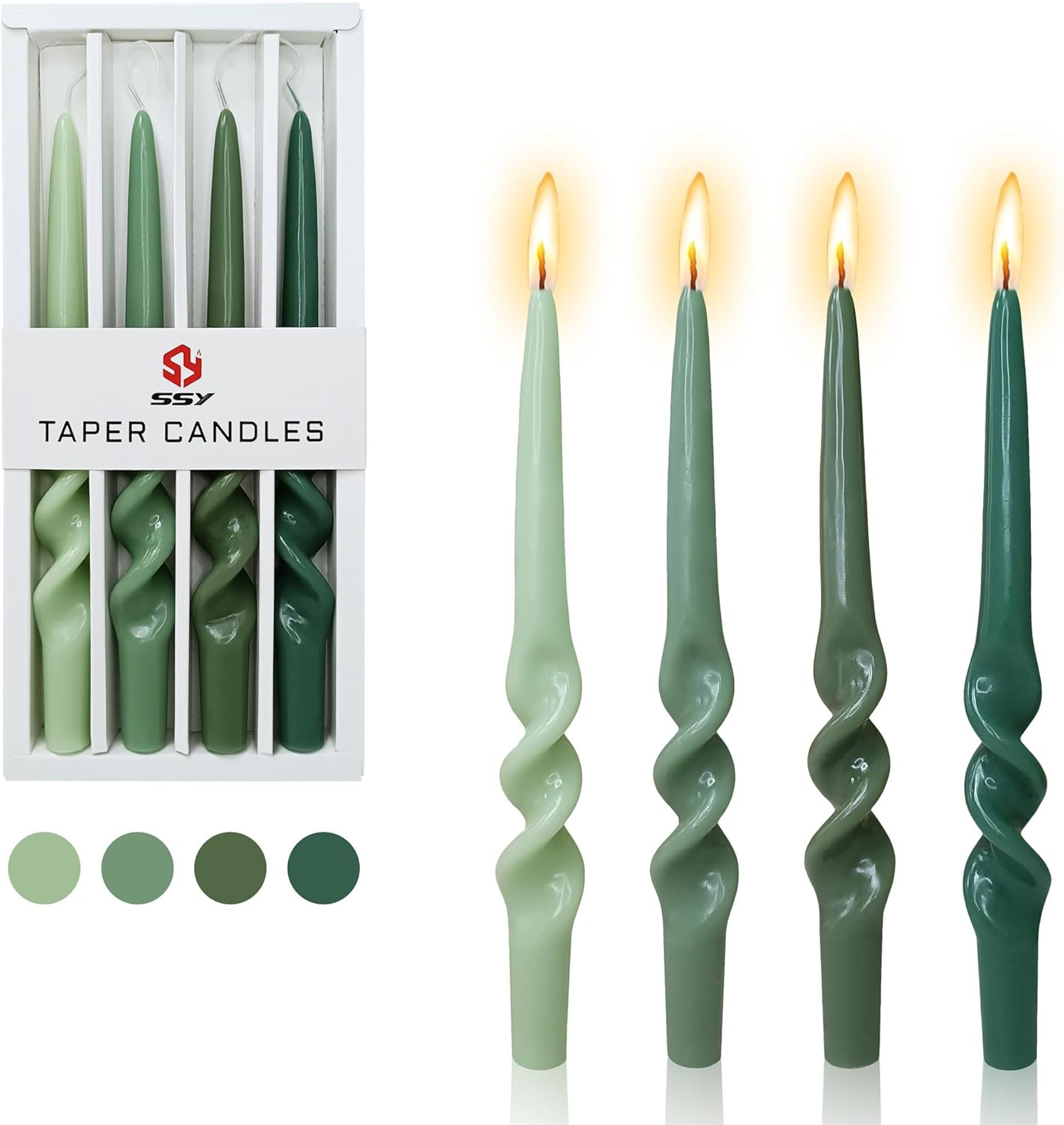 SMOKELESS CANDLES and ENVIRONMENTALLY FRIENDLY: Gedengni green candle sticks are made of high purity paraffin, clean cotton wicks, and eco-friendly dyes. The white candles burn smoke-free, without releasing soot or other harmful contaminants, making them a safe and eco-friendly choice for your home. UNSCENTED and ODORLESS CANDLES: Our tapered candles are designed to be non-drip, unless placed in a breezy space or at an angle on the candlestick. The spiral candles are unscented, ensuring your home stays clean from toxic fumes and unpleasant smells. LONG-LASTING BURN CANDLES: Our green candlesticks feature a graceful tall taper shape that allows for a long-lasting burn time. You can enjoy their warm glow for hours on end. The candlesticks are 3/4 inch in size, making them suitable for any standard candlestick holder. HANDMADE CANDLESTICKS: Each taper candle is unique and due to its handmade nature, there may be some wax frosting or small bubbles on the surface, but these don't affect the quality of the candles. Pure handmade candles have different temperatures for each batch, so the color of the candlesticks will also change slightly. UNIQUE TAPER CANDLES GIFT: Our twisted candlesticks feature a wax ingredient and ocean ripple shape, making them suitable for any interior design style from Scandinavian minimalism to colorful boho settings. Our spiral taper candles make the perfect dining accompaniment and a unique gift for lovers, mothers, and friends.