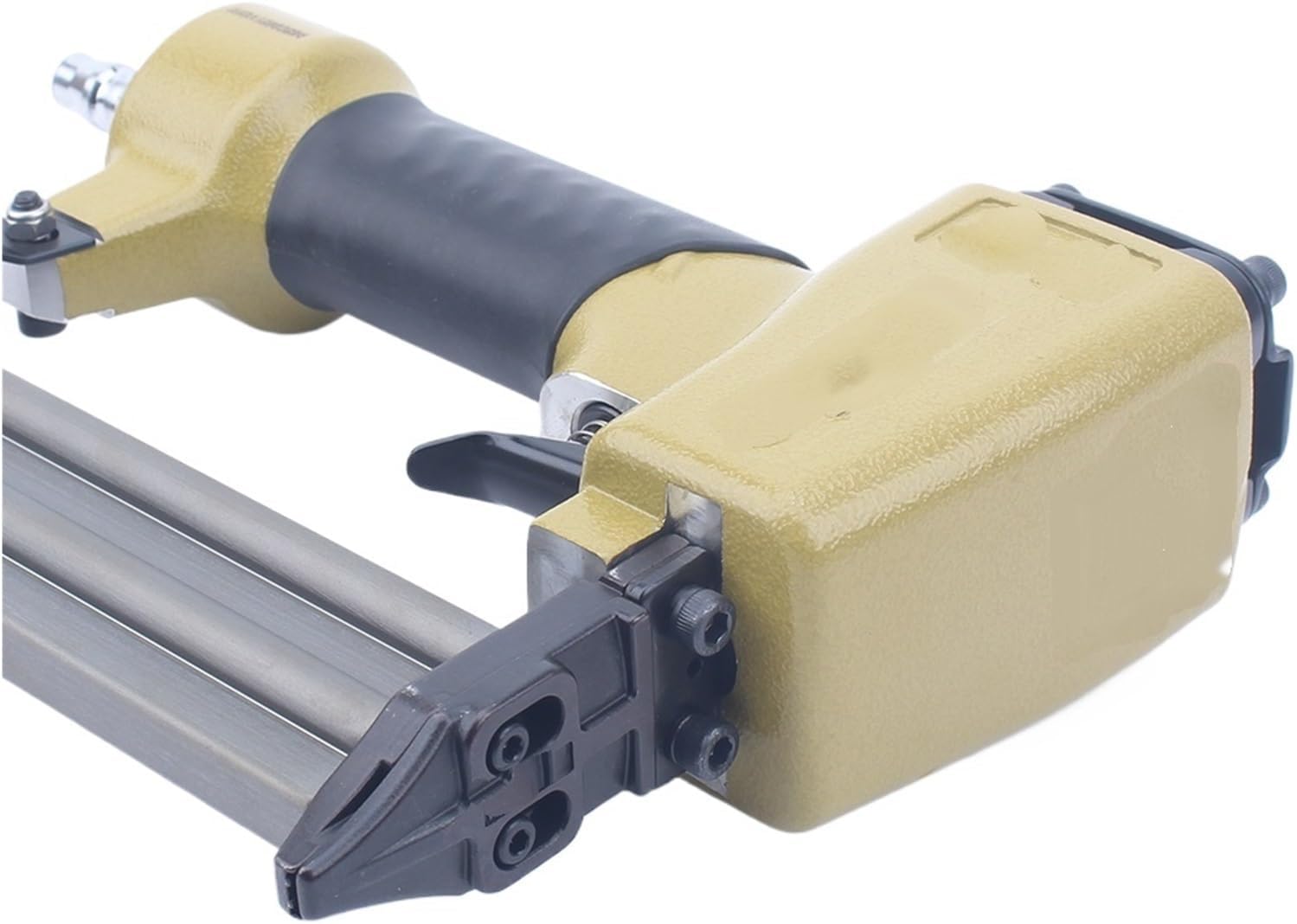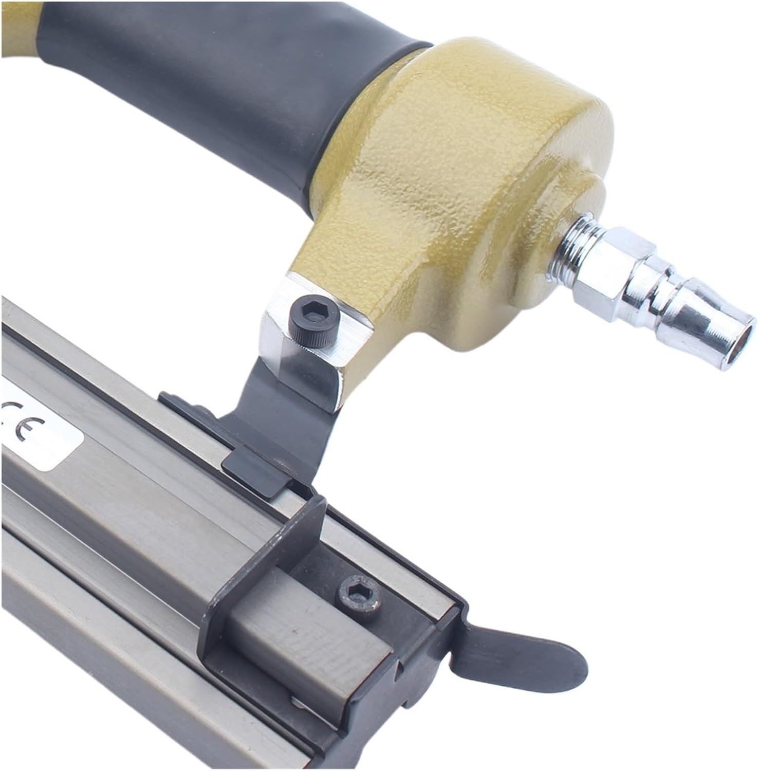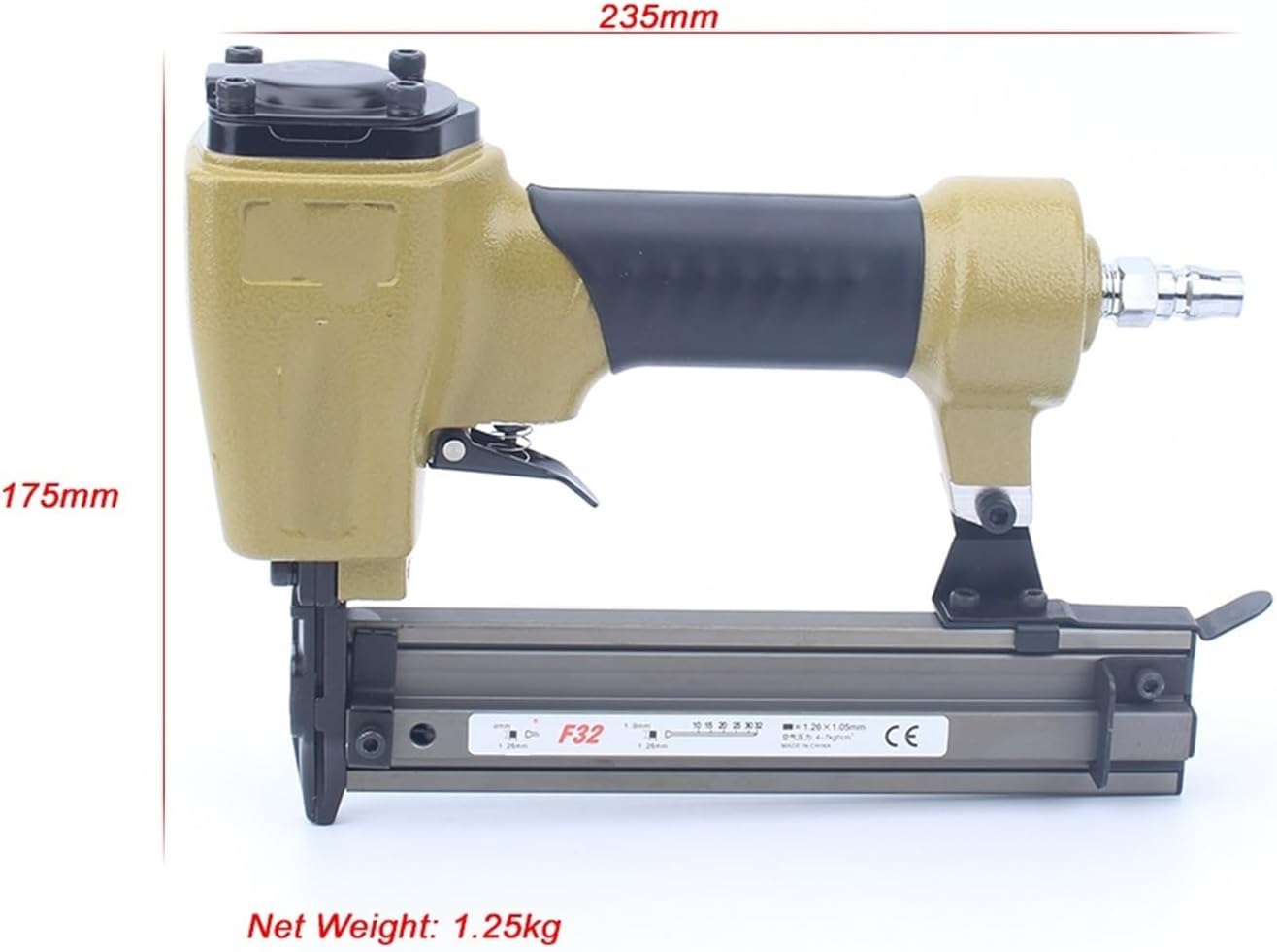 1. By manually turning the depth adjustment wheel, you can change the driving depth of various engineering and material staples.2. Features comfortable grip and 360° adjustable exhaust.3. Easy bottom loading and quick removal of clog release.Model: F32Dimensions: 60*175*235mmCapacity: 100pcs/coilAir Pressure: 4-7kg/cm2Fitting Tube: 6mmLength of nail:10-32mmDiameter of nail:1.26mm*1.05mmNet Weight: 1.25kg