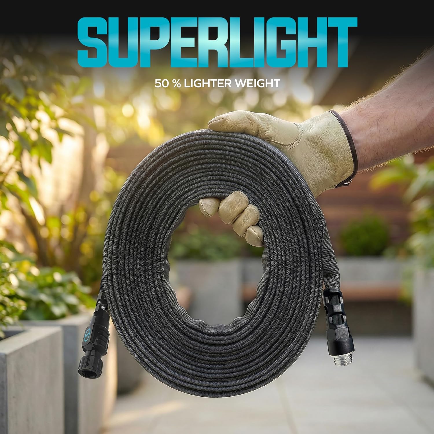 Say goodbye to tangled, kinked, and heavy hoses with the FIBERJACKET Garden Hose from AQUA JOE. Built from rugged marine-grade FiberJacket material surrounding a 5/8" flexible inner core, the rip- and abrasion-resistant fabric is gentle on delicate and painted surfaces — no scratching, scuffing, or snagging. The innovative dual-layer design features crush-proof construction with corrosion-resistant aluminum fittings, built to withstand demanding conditions while maintaining flexibility down to 0°F. Designed to dry quickly after use, you'll never deal with a heavy, hot, grimy, or slimy hose again. Leak-proof aluminum fittings deliver a solid, reliable connection, while the kink-, twist-, and tangle-resistant design ensures uninterrupted water flow for all your yard and garden needs. Ergonomic grips provide a comfortable, secure hold for easy one-handed spigot connection. Weighing significantly less than traditional rubber hoses, AQUA JOE is burst-rated to 600 PSI and coils easily for compact storage — even in tight spaces like shelves or garages. Available in 25', 50', 75', and 100' lengths to suit a wide range of watering tasks around your home, yard, garden, boat dock, or garage.