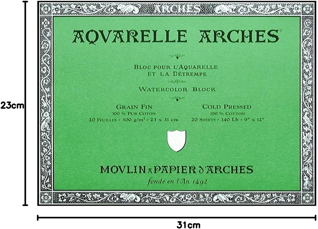 Arches Watercolor Blocks contain paper made with natural cotton fibers on a cylinder-mold machine. This artist-grade watercolor paper is great for watercolor, gouache, acrylic, and airbrushing. Arches is made with a natural gelatin sizing. These blocks contain 20 sheets of natural white, acid free, 100% cotton paper, and are glued on all 4 sides. This block is 9"X12" cold press 140lb / 300g.
