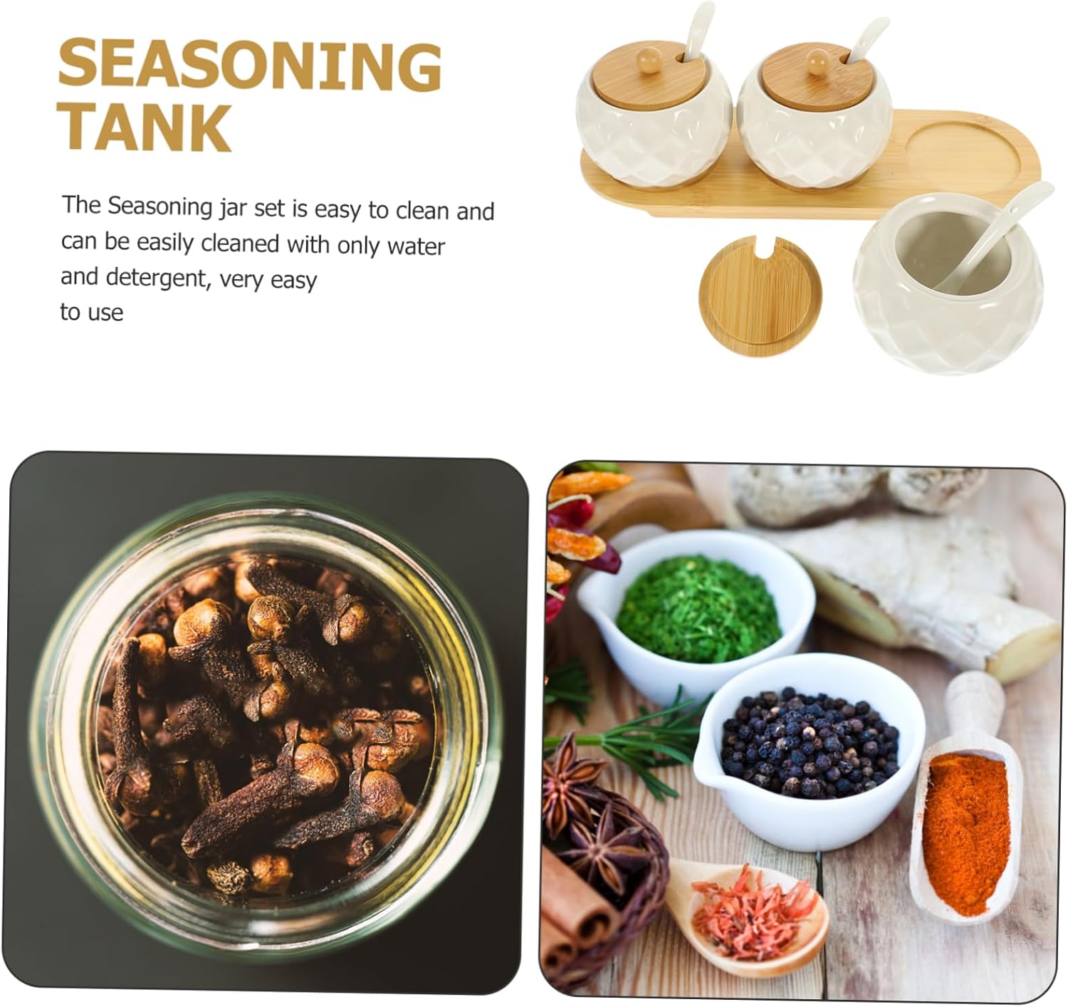 Package List 3 x Seasoning Jars 1 x tray Characteristics -Material:Ceramic, dispenser -Size:28.40X9.50X1.00cm/11.16X3.73X0.39in(tray) spice jars with lid -Size:9.00X9.00X7.00cm/3.54X3.54X2.75in(jar) kitchen seasoning jar -Color:Multi spice jar - This set is for organizing your spices and seasonings, making it easy to find what you need spice dispenser. - The seasoning jar set is well sealed to keep food fresh and avoid cross-odors, give you more convenience to use kitchen salt jar. - The tight seal keeps your spices and seasonings fresh and flavorful, ensuring that your dishes are always delicious seasoning dispenser. - The diamond pattern of these Seasoning Jars adds a touch of elegance to your kitchen decor, delicate storage holder. - The ceramic and material is for storing food, making it a healthy choice for your kitchen spice holder.Goods Descriptionhousehold spice container Excellent workmanship, give maximum attention to every detail to give it a stylish and appealing look.spice jars with lid Are you looking for a Seasoning Jar? , ! Our product must meet your needs.seasoning organizer Fine workmanship practicality and durability.condiment dispenser It is made of and ceramic material, and sturdy for use
