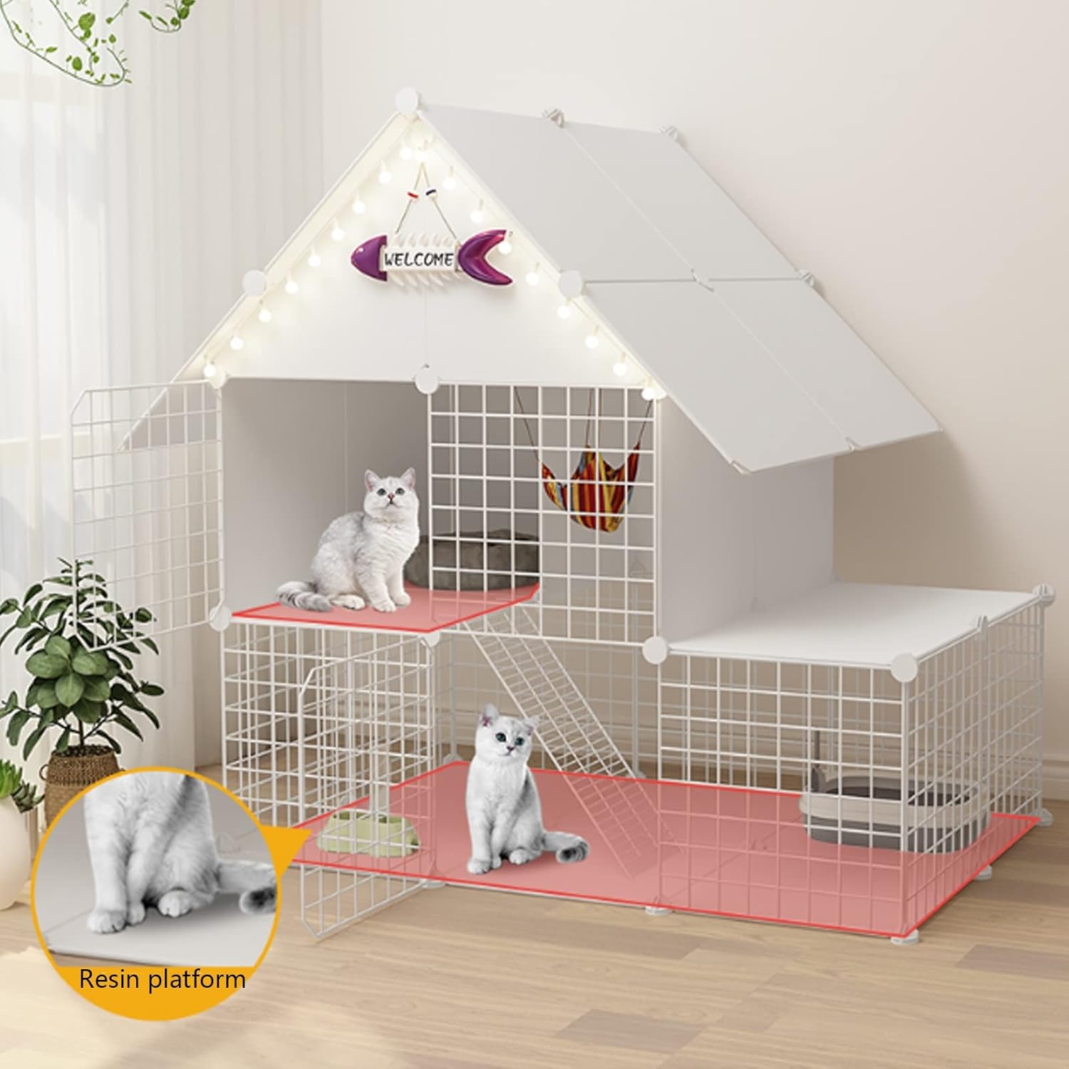 Cattery specifications Name: DIY cat cage / Pet fence / Pet playpen / Cat enclosure / Cat crate / Cat house / Cat cage villa / Cat apartment cage / Cattery Material: Metal, ABS plastic, Resin Size: (The size is as shown in the picture) 75*39*110cm , 111*39*110cm , 75*75*110cm , 75*39*146cm , 111*75*146cm , 75*75*146cm Colors: Blue, Green, Pink, White Package A: Installation tools Package B: Installation tools, litter box, hammock Package C: Installation tools, litter box, hammock, litter box Package D: Installation tools, litter box, hammock, litter box, cat bowl Suitable: Cats, guinea pigs and ferrets , Rabbits and other small pets Cat enclosure is a must-have for any cat lover. The cage package comes with concise and hassle-free assembly instructions, requires no tools to be added, and can be installed in 15-30 minutes. The cat cage can be fully folded when not in use for easy storage and portability without taking up your space. Note: This product includes only one cage in the picture, other accessories in the cage are not included. If you need other accessories, you need to buy the package, there are 4 kinds of packages A,B,C,D to choose. Packing list: Cat cage *1 Package A/B/C/D *1