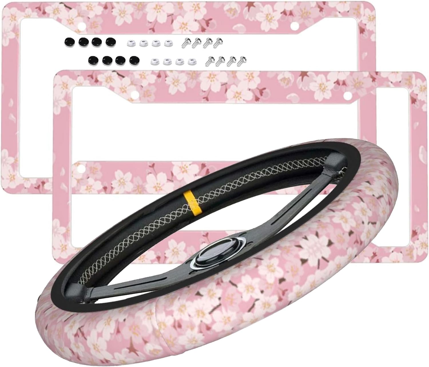 Made Of High Quality Aluminum Material:Lightweight aluminum license plate frame, strong and durable, anti-corrosion, rust-proof and weather-resistant;license plate rust proof! Us & Canada Standard Size: License Plate Frame Measures 12.2 X 6.3 Inches.Fits Standard Us And Canadian License Plate Frames.It will add the perfect patriotic look to any car, truck, SUV, motorcycle, trailer or motor home!Steering Wheel Covers Is Made Of Neoprene, Environmentally Friendly, Odorless, Anti-Slip And Heat Resistant, Breathable And Comfortable For All Seasons. Steering Wheel Covers For Cars Suitable For Round Or D-Shaped Steering Wheels With A Standard Size Of outer diameter 14 1/2 inch to 15 inch(37.5cm to 38cm), Suitable For Most Vehicles Such As Off-Road Vehicles, Trucks, And Cars. Foldable Design, Easy To Carry, Easy To Install,Does Not Require Any Tools.The kit contains:1 x Steering Wheel Cover2 x License Plate Frame8 x black Screw Caps8 x Machine License Plate Screws