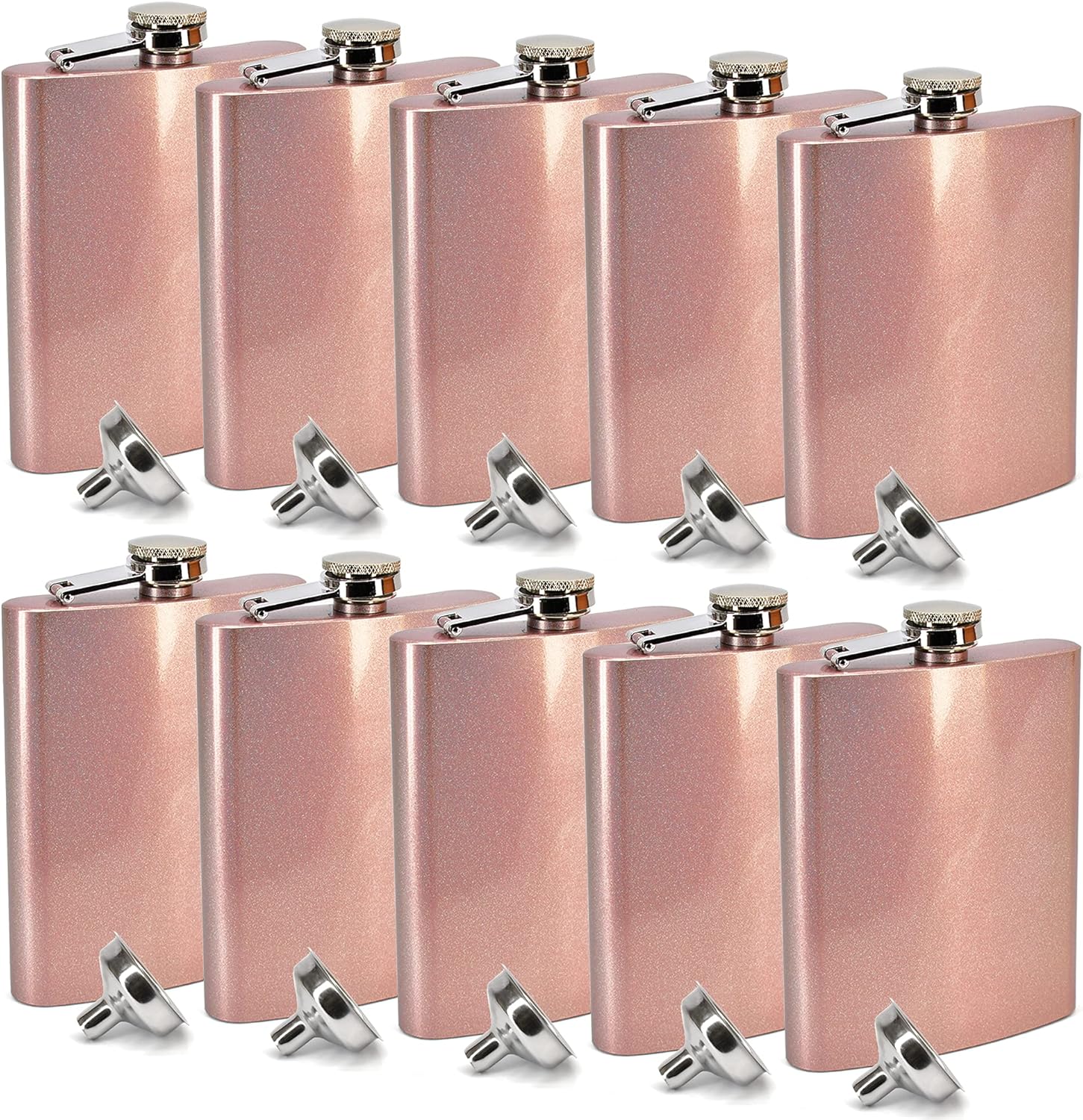 Pack of 10 Clear Water Home Goods 8oz Rainbow Electroplated Stainless Steel Hip Flask with Funnel. Each flask is packaged in its own white gift box. For Durability, each flask is made with half mil. stainless steel construction and includes hinged screw on cap so it can't be lost. Can be brought to any local laser engraver to be personalized.