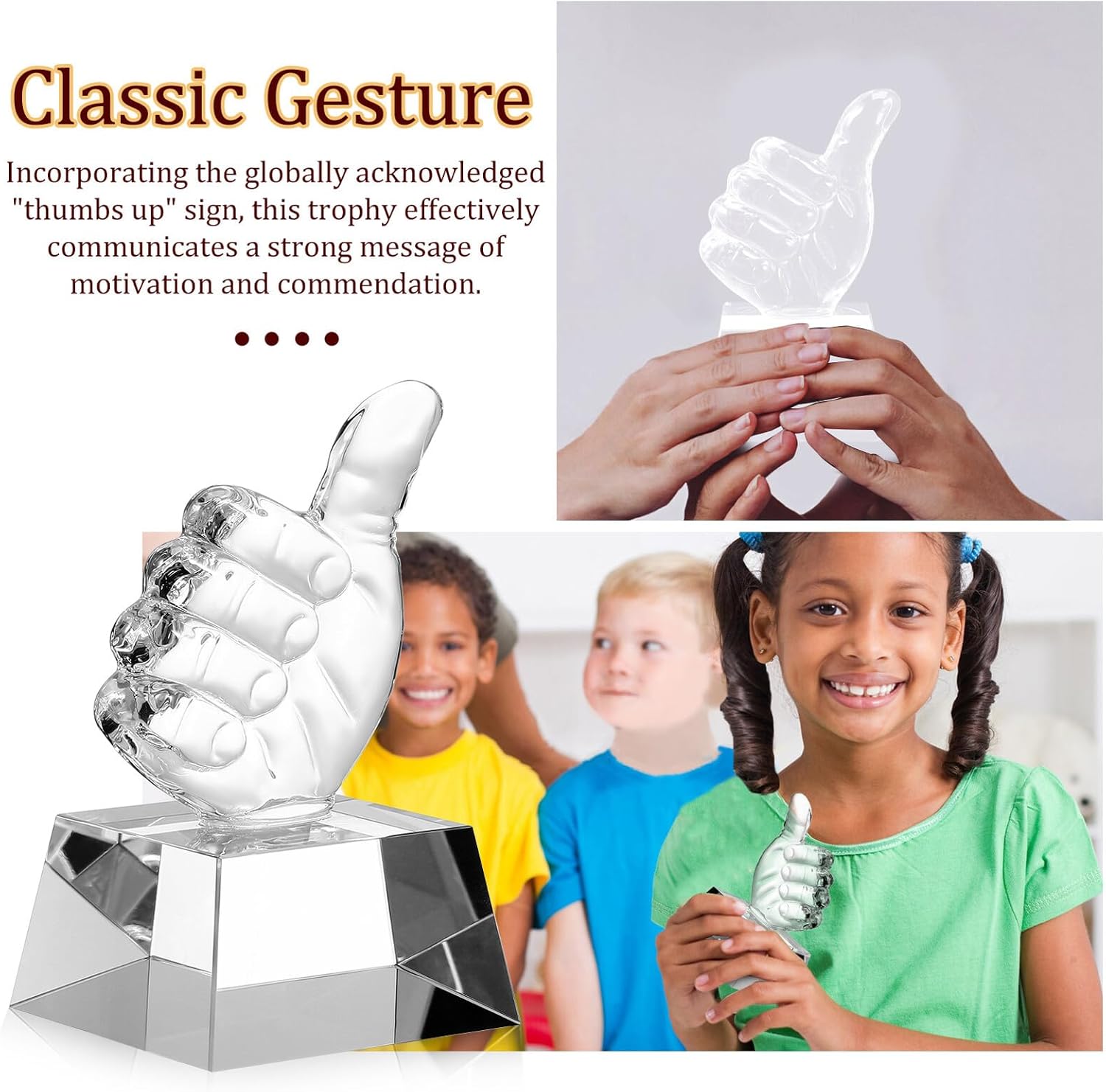 Package Include 2 x trophies Features -Thumbs up gesture: Designed with the universally recognized "thumbs up" symbol, this trophy conveys a powerful message of approval, encouragement, and recognition crystal trophy. -Award trophy: Perfect for corporate award ceremonies and sports competitions, this thumb up trophy is sure to be a hit with recipients and alike Thumb Up Award Trophy. -Fine workmanship: Meticulous attention to detail has been paid in the creation of this crystal trophy, resulting in a stunning appearance that is sure to impress awards. -Material:Crystal -Size:12.00X6.50X6.50cm/4.72X2.55X2.55in -Product Info:Crystal Trophy -Color:Transparent -Wide application: This versatile crystal trophy can be used as a prize, present, or decorative item, making it a great choice for a variety of occasions and settings Decorative Trophy Model. -Highly clear: This finger trophy boasts high transparency, allowing for an impressive light refraction effect that catches the eye and enhances your place small trophy award.Goods Informationaward Expertly carved from crystal, this trophy showcases the thumbs up gesture beautifully.small trophy Its clean lines, precision-cut enhance sophistication.award trophies Celebrate your exceptional achievements with our Crystal Thumb Up Trophy, an keepsake that encapsulates the universal symbol of approval and admiration