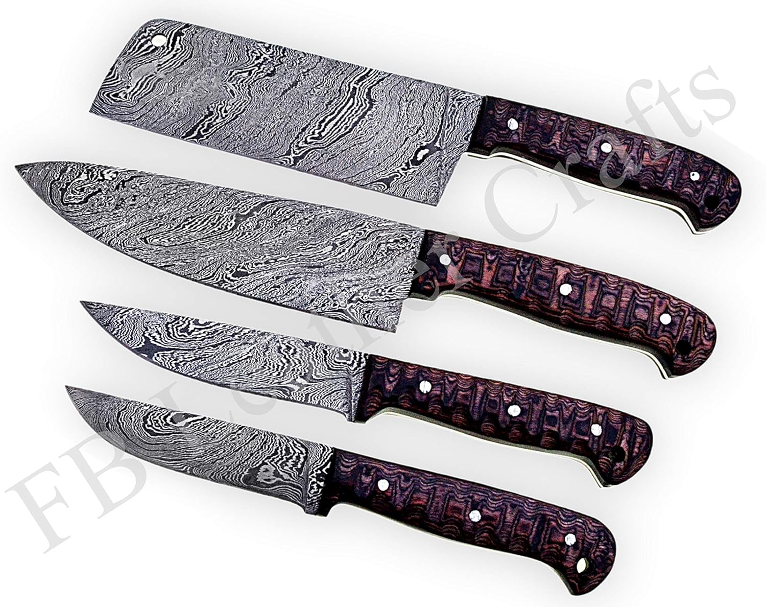 Custom made Damascus steel 4-Pieces Kitchen Set, Handle: Excellent Combination of Black Colored Wood With Beautiful Engraving, Sizes From top to bottom (1). Smart Cleaver Full Length 11.5-inches, Blade 6.5-Inches, Handle 5-Inches, (2). Full Length 12-inches, Blade 7-Inches, Handle 5-Inches, (3). Full Length 9-inches, Blade 4.5-Inches, Handle 4.5-Inches, (4). Full Length 8.25-inches, Blade 4-Inches, Handle 4.25-Inches, Also this Product include Custom Made Real Cow Hide Kit Roll. The High Grade Damascus Steel Used For This Blade Consists Of Layers Of Low Carbon & High Carbon Mixture Welded, Forged & Hammered Several Times To Obtain Up To 416 Layers. The Hardness Of This Blade Is Up To 55 HRC On The Rockwell Scale. This Blade Will Stand The Test Of Time, Holding Its Sharp Edge. How To Care For Your New Knife: Store In A Dry Place, Moisture Encourages Rust After Use, Wash & Dry The Blade & Apply Vegetable Oil, OR Any Lubricating Oil. Damascus Is Very Easy To Clean with WD40 if Rusted.