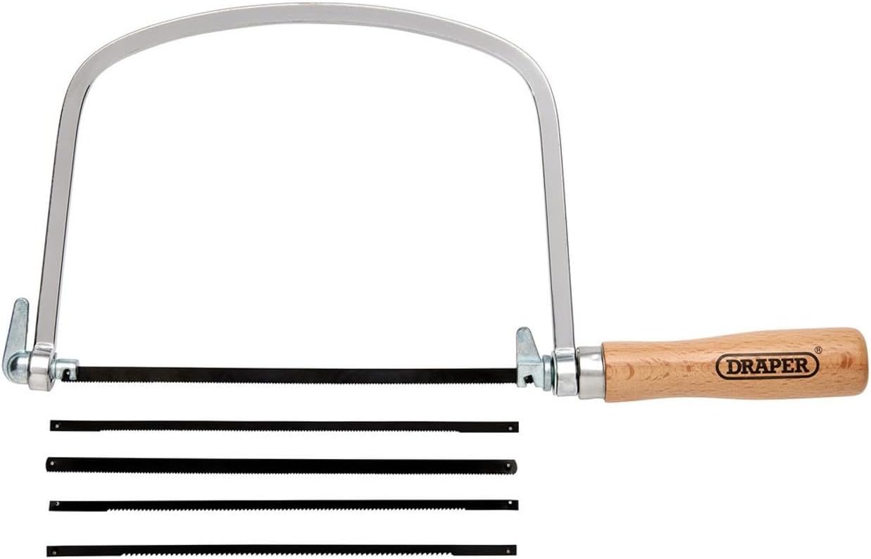 Chrome plated frame with wooden handle and Supplied with five assorted blades. Blade can be turned through 360° for intricate work.