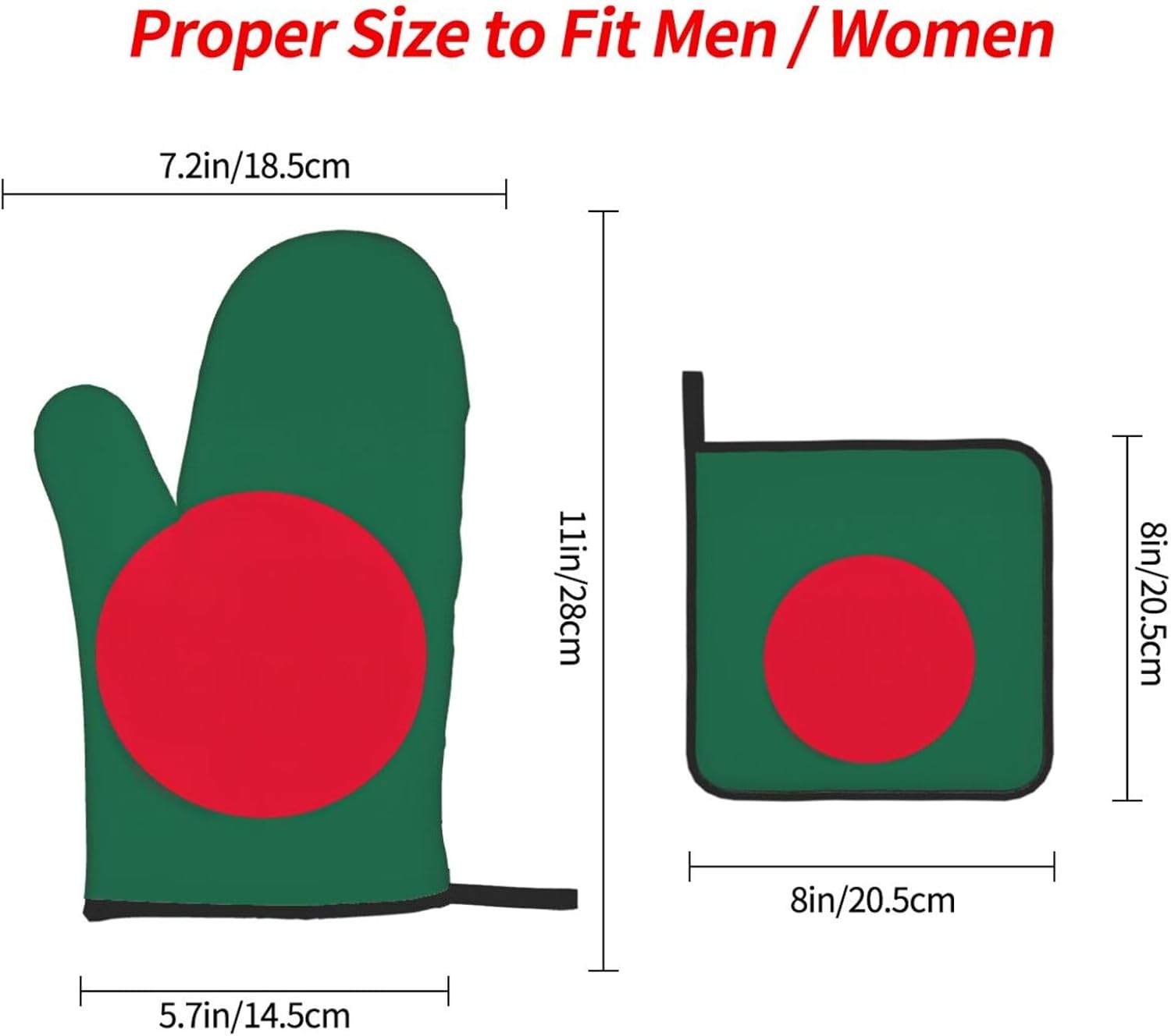upgrade your kitchen safety with this Flag of Bangladesh print microwave gloves, oven mitts and pot holders sets. crafted from water repellency polyester and heat-resistant fabric, these kitchen baking three piece set offers reliable protection for hands while handling hot items. the double-layer waterproof design ensures easy cleaning after use. suitable for various cooking scenarios including microwave ovens, conventional ovens, stovetop cooking, and outdoor grilling. the side hanging rope allows convenient storage when not in use. the thick construction provides excellent heat insulation without compromising dexterity. this unisex kitchen essential combines functionality with practical design for everyday cooking needs. the heat-resistant gloves maintain comfort while offering superior protection against burns. an essential addition to any modern kitchen setup