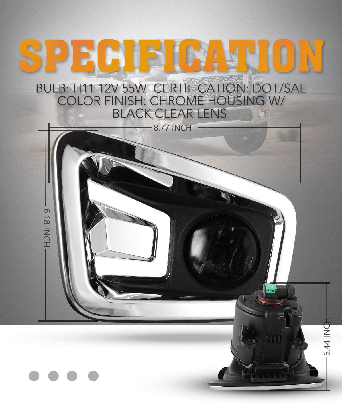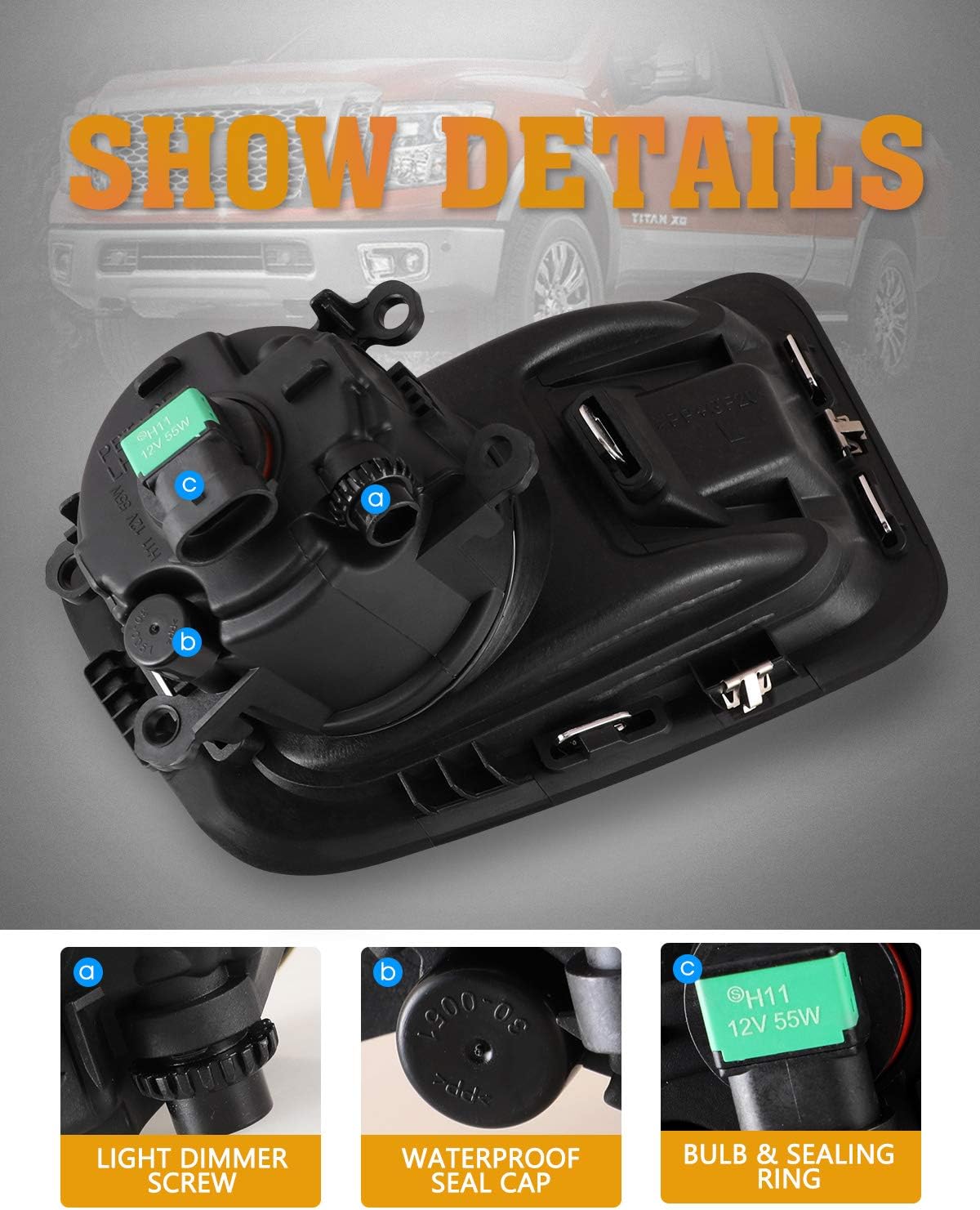 AUTOFREE is a new automotive lighting brand with strong technical support. We committed to provide high quality products and considerate service to every driver. You can enjoy the pleasure of driving and the fun of performance while ensuring your safety. We hope you are satisfied with every time shopping experience. Specification Bulbs: H11 12V 55W Wiring Harness: Included Certification: DOT/SAE Compliance Color Finish: Black housing/Chrome Reflector/ Smoke Lens Replaces Original (OE) Part #: Frame- 62257EZ02B; Lamps- 261509B90E Fitment 2017 Nissan Titan 2018 Nissan Titan 2016 Nissan Titan XD 2017 Nissan Titan XD 2018 Nissan Titan XD 2019 Nissan Titan XD Package Include 1 Pair Fog Lights Assembly (Left and Right Side) 2 Bulbs Wiring Harness & Switch