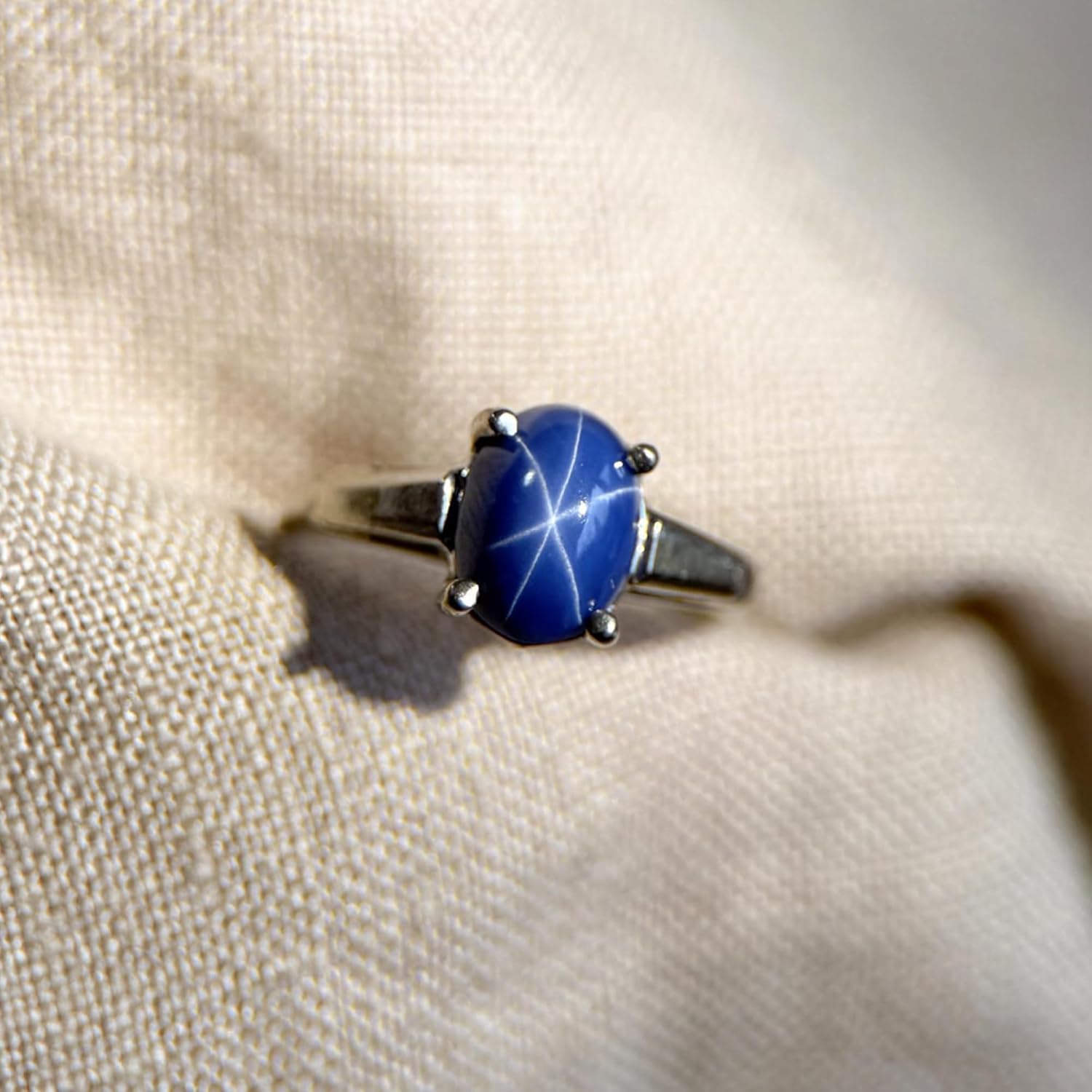Handmade blue star sapphire sterling silver 925 ring ensconces an earth-mined star sapphire gemstone between white sapphires. The oval-shaped star sapphire displays a 6-ray floating star (observed only when exposed to natural sunlight). Both the star sapphire cabochon and the white sapphire accents are set in a solid sterling silver ring setting.