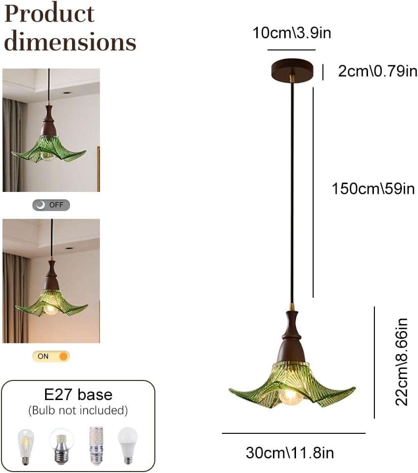 About Us:We Are Committed to Turning Our Lamps into an Indispensable Part of Your Life, Lighting Hope for You, and Witnessing Every Important Moment of You.【Specification】:Dimensions:Dia 30Cm/11.8InHeight 22Cm/8.66InAdjustable Hanging Wire 150Cm/59InCanopy Dia 10Cm/3.9In*Height 2Cm/0.79InColor: ?Transparent, Green, BlueMaterial: Glass,WoodStyle: VintageLamp Type: LightProduct Specific Use: ?HomenishingIndoor/Outdoor Use: ?IndoorLight Source Type: E26/E27Voltage: 110V/220V-240VNumber of Light Sources: 1Whether to Ba Light Source: NoBulb Requirements: Energy-Saving Bulbs, Cfl and Led EtcInstallation Type: HangingControl : Wall Control SwitchApplicable Scenes: Bedside,Corridor,Entrance,Bedroom,Living Room,Study Room,Child's Room,Hallway,Dining Room,Etc.【Package Content】:1*Light1*Installation Accessories