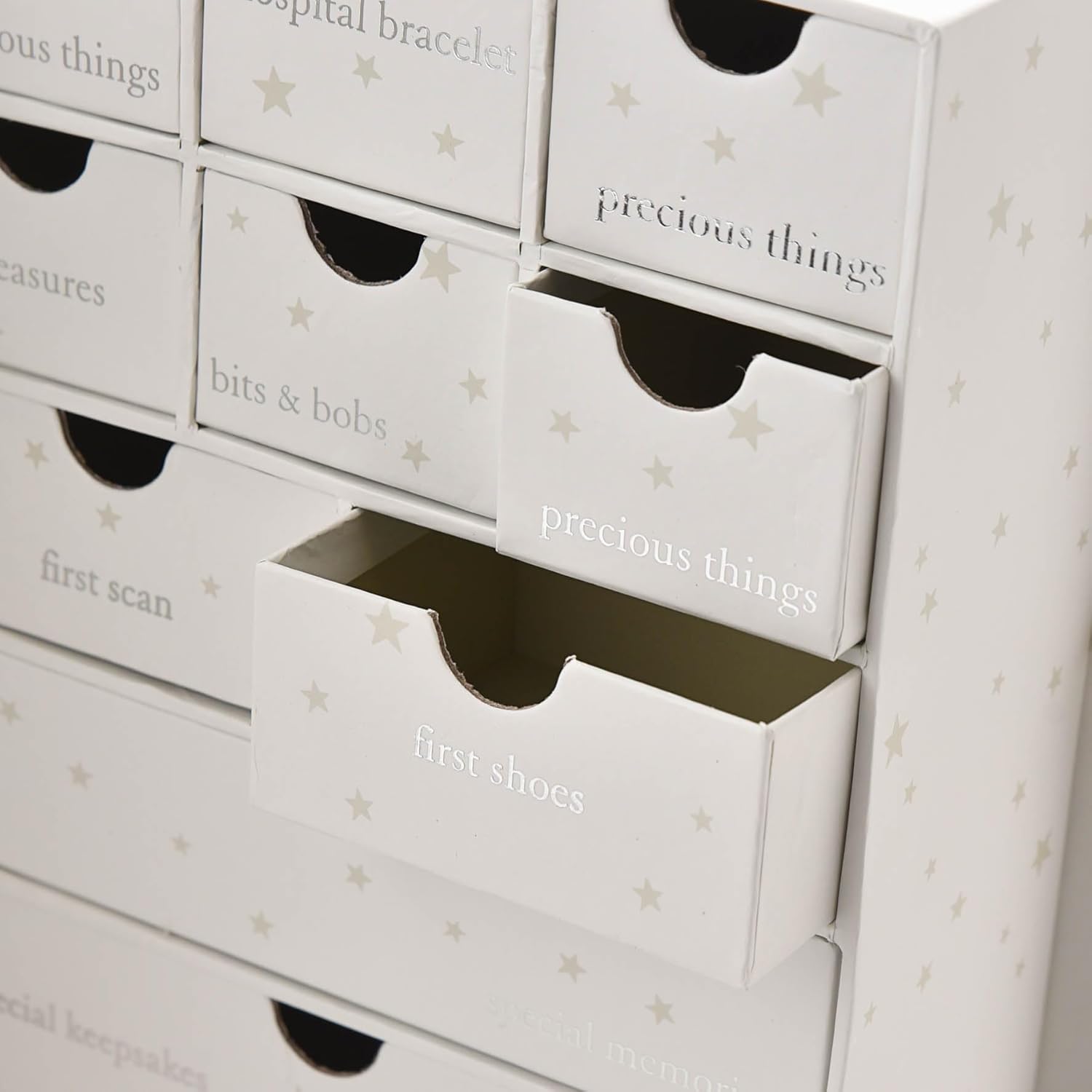 Capture precious memories with the keepsake box from Bambino by Juliana. Crafted with an ivory finish, it features a delightful 'Twinkle Twinkle Little Star' decal adorned with printed pram, teddy bear and rocking horse icons for an extra touch of whimsy. Open the box and discover ten individually labelled drawers finished off with an ivory satin bow closure. This treasurable keepsake box provides beautiful organisation to store your most cherished new born mementos. Total product dimensions are: Height - 11.2", Width - 9.1", Depth - 3.7".