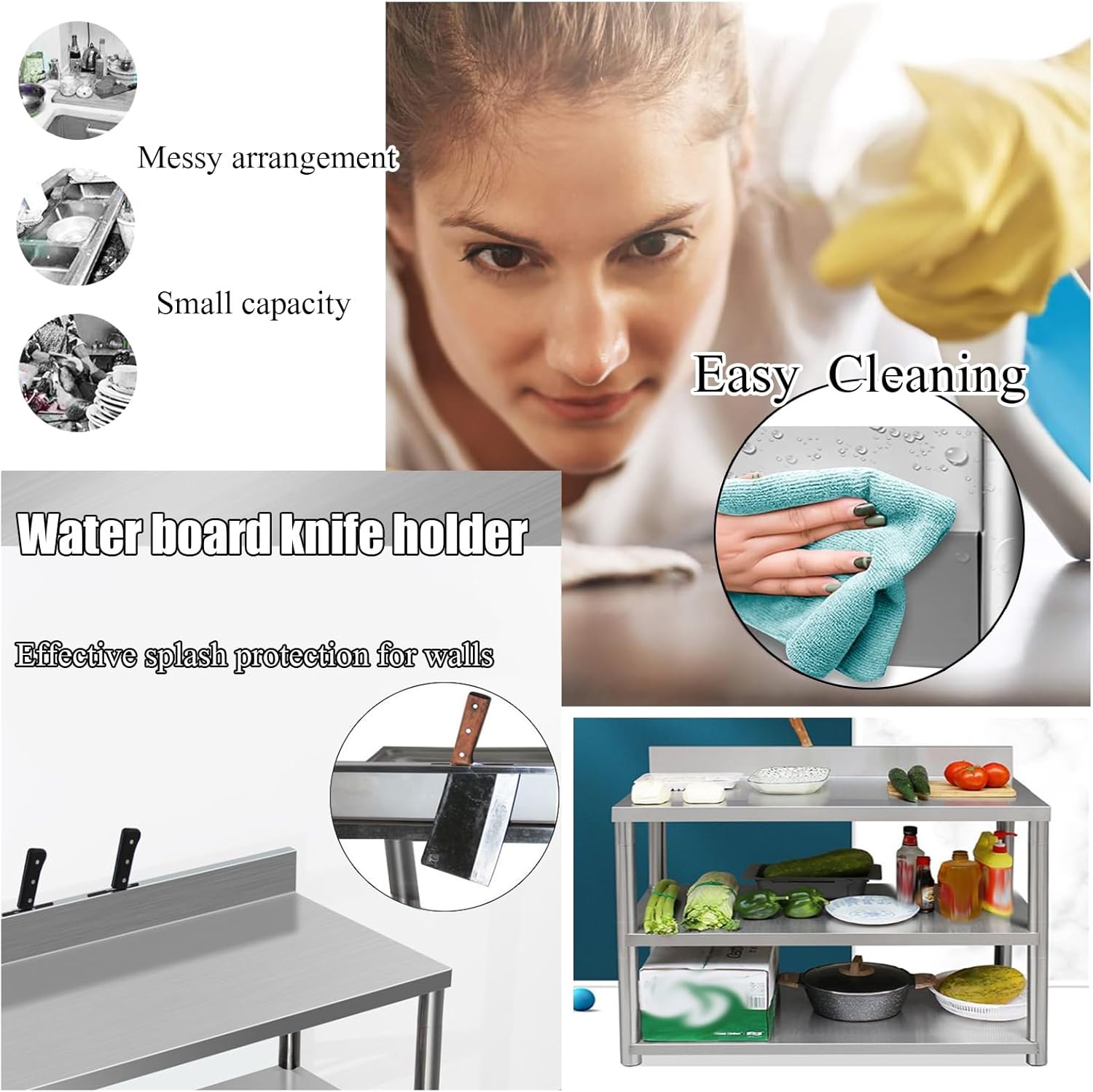 Constructed from high-quality stainless steel, this versatile prep table provides a durable and hygienic surface ideal for a variety of food preparation tasks. Its polished finish effectively resists rust and corrosion, making it suitable for demanding environments such as professional kitchens, restaurants, hotels, garages, and bars. The easy-to-clean design ensures quick maintenance; a simple wipe with a cloth or paper keeps the surface spotless. Designed for practicality, the three-tier layout offers generous storage space, which is essential for maintaining organization in commercial settings. The straightforward assembly process, aided by clear paper or video instructions, allows for quick setup of your workspace. Enhanced leg fasten locks provide stability, while the adjustable undershelf height, clearly marked on the legs, allows for customization to suit your specific needs. To ensure the perfect fit, we recommend measuring your available space before making a purchase. Please note that slight color variations may occur due to different screen displays, and manual measurements may have a margin of error of 1-3mm. This prep table not only enhances your workspace efficiency but also helps maintain a clean and professional atmosphere, making it a must-have addition for any culinary or commercial setup.
