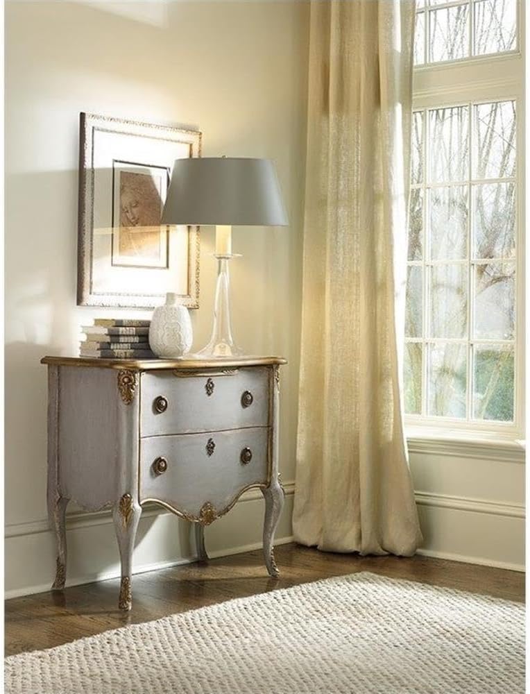 Graceful and romantic, this enchanting soft gray chest is offered in a vintage French style with exquisite design details like gold leafing, shapely cabriole legs and a gold-leaf ornamental keyhole escutcheon on each drawer. Crafted of Poplar Solids and Gold Leaf, it features two drawers and is a compact 30 inches wide.Features:Composed of Poplar Wood SolidsFrench Two Drawer ChestMetal accentsTraditional styleLight Blue / Gray distressed finishGold Leaf accentsSpecifications:Product Dimensions: 30" H x 30" W x 16" DProduct Weight: 86 lbs