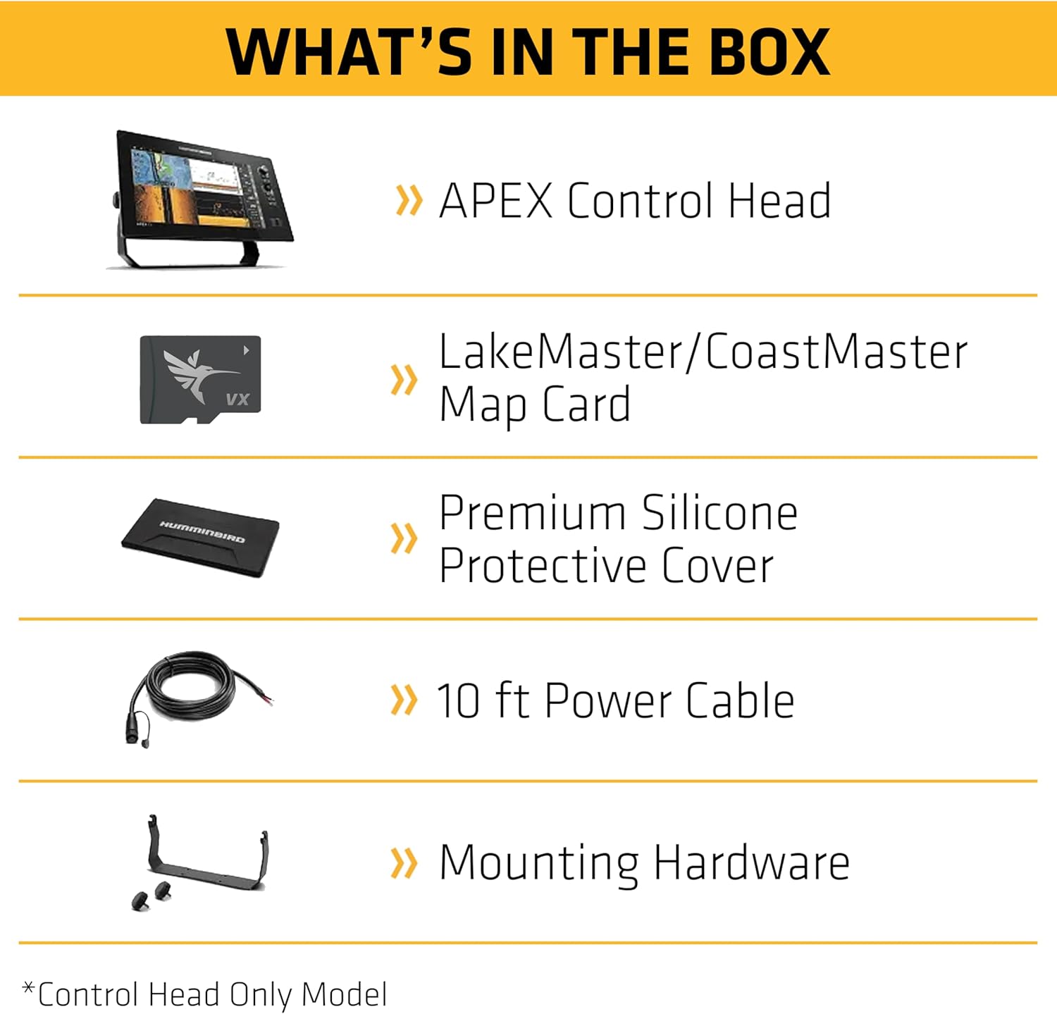 Take command of your fishing trips with the Humminbird APEX VX Chartplotter, the ultimate angling system. The sharp 13.3” full-HD, Cross Touch display provides a crystal-clear view of the world below the water, while giving you the choice of touchscreen or keypad control for a completely customized experience.Find your fishing spots faster with included LakeMaster and CoastMaster VX Maps. Navigate over 13,000 lakes, waterways, and coastal waters in the United States and Canada with confidence.Built with serious anglers in mind, APEX has a dedicated dual-channel sonar port for accessory 2D CHIRP transducers up to 2kW. Equipped with industry-leading technologies ‒ MEGA Side Imaging+, MEGA Down Imaging+, and Dual Spectrum CHIRP sonar ‒ APEX gives you a complete picture of structures and fish beneath your boat.Unlock the full potential of your rig with the One-Boat Network. APEX seamlessly integrates with Minn Kota motors for precise boat control and Cannon Optimum downriggers for wirelessly controlled deep-water presentations. With dual ethernet ports, you can easily build a professional-grade, multi-station system without the need for an external hub, and HDMI In/Out ports allow for connecting cameras or outputting your display to other screens.The APEX VX is more than a fish finder; it's a fully-integrated command center designed to maximize on-water performance, getting you to fish and keeping you there.