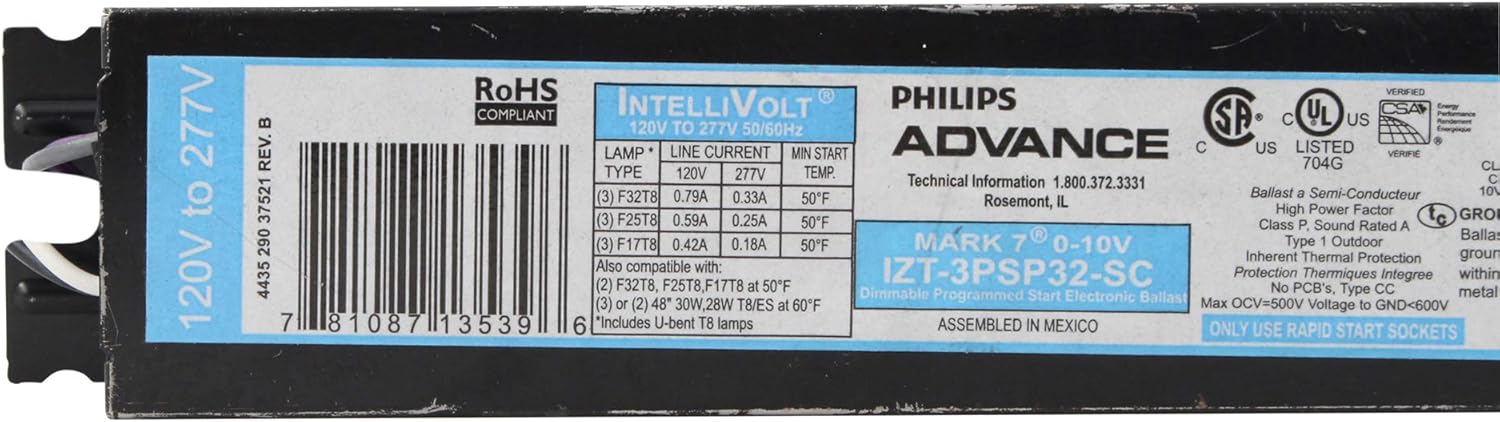 Dimming Ballast, Ballast Type Electronic Dimming, Ballast Family Mark 7, Number of Lamps 3, Lamp Type T8, Lamp Length 48 In. , Voltage 120/277, Height 1-3/16 In. , Width 1-45/64 In. , Length 9-1/2 In. , Input Watts 94, Number of F17T8 Lamps 3, Number of F25T8 Lamps 3, Number of F28T5 Lamps 0, Number of F32T8 Lamps 3, Number of F32T8U Lamps 0, Number of F40T12 Lamps 0, Number of F40T12 U-Bend Lamps 0, Amps AC 0. 46/0. 20, Start Type Programmed, Min. Starting Temp. 50 Degrees F
