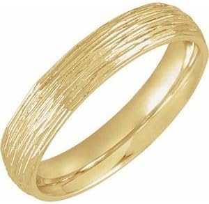 Discover jewelry that adds a gorgeous, sophisticated glow to any outfit, effortlessly enhancing your ensemble with its timeless elegance. Each piece adds a touch of nature-inspired beauty to your look, infusing it with a sense of organic charm and understated allure.From delicate necklaces to statement rings, explore a collection designed to complement your individuality and elevate your aesthetic effortlessly. With these pieces, embrace a lifestyle where style meets comfort, and beauty meets versatility.Specifications: Quality: 10K Yellow GoldFinger Size: 4Width: 3 mmFinished State: PolishedDescription: Bark-Style Comfort-Fit Band With Bead Blast Finish