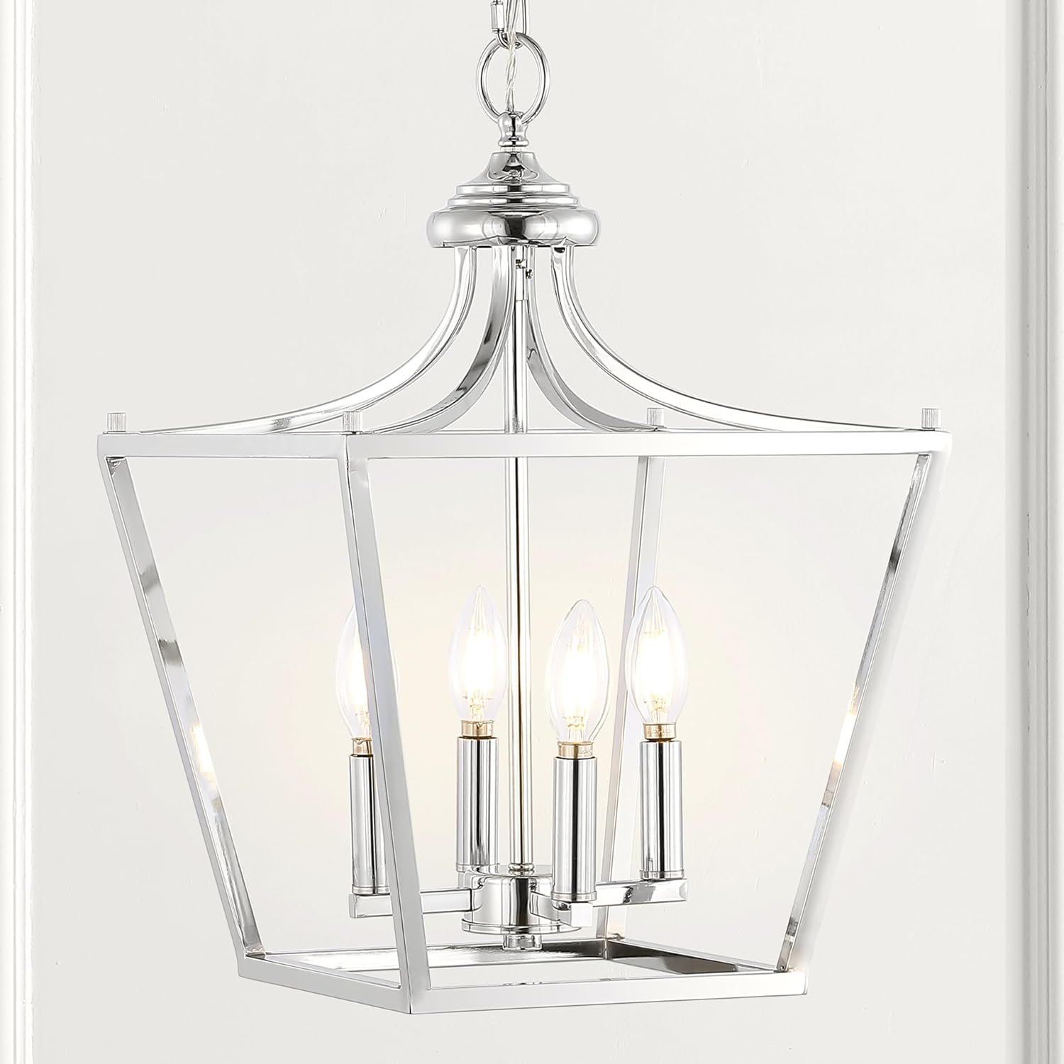 Perfectly sized for a kitchen island, breakfast table, entry or hallway, the timeless silhouette of our pendant lantern is updated with a polished chrome finish. The open frame contains four candles with LED bulbs that provide warm light for a vintage touch. With its adjustable chain, this versatile lantern is ideal for a modern farmhouse kitchen, rustic entry, or traditional foyer.