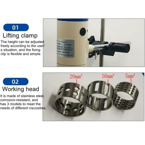 Description: JRJ300-SH Digital shear emulsification mixer applies to the mixing, emulsification of biology, physics, chemistry, cosmetics and health care products as well as food and other liquid/solid powder scattered, uniform and organization besides, it also applies to plasma cells mashing and experiment slurrying. Technical Parameter: Model:JRJ300-SH Voltage:220V; 50Hz (Does not support 110V) Input power:850W Output power:500W Speed range:200-11000rpm Stirring capacity(h2o):500-40000ml Max viscosity:8000mPas Rated torque:34.1N.cm Working head material:304 Stainless steel Working head diameter:φ70mm Standard Stator configuration:5mm²/20mm²/50mm² Speed control:Stepless speed regulation Speed motion detection function:Yes Timer function:Yes Speed memory function:Yes Overload protection:Yes Permissible ambient temperature:<40°C Permissible relative moisture:<80 % Weight:9.2kg Size:215*310*720mm