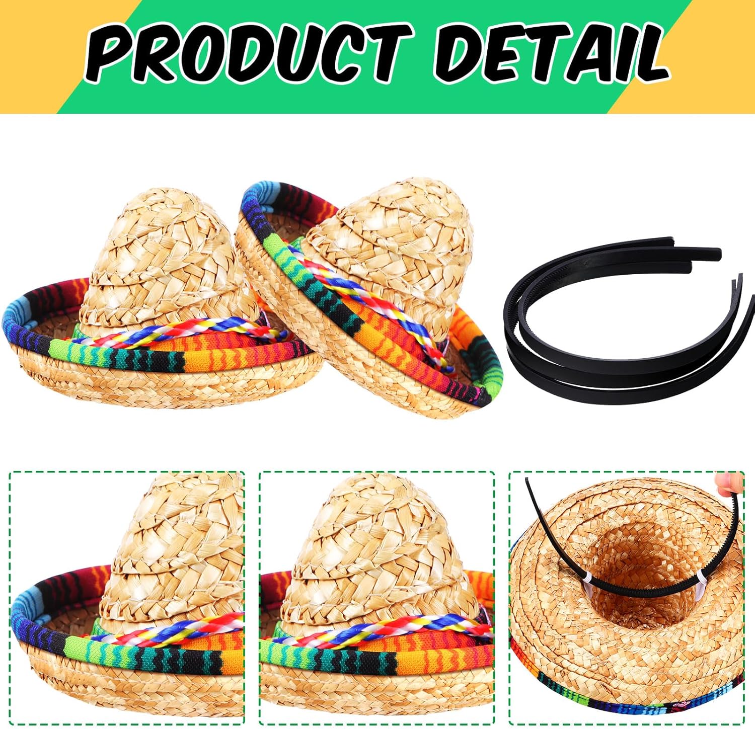 Features: These cinco de mayo hats are suitable for parties and provide an enjoyable sense which encourage people to wear them, creating a lively ambiance, and adding excitement to most events. Small sombrero party hats' design is straightforward, yet it is eye catching. The simplicity of the design makes them easy to match with other decorations and costumes, making them good additions to most occasions. Specifications: Main material: straw Color: as shown in the pictures Size: about 5.9 inches/ 15 cm in diameter, about 3 inches/ 7.5 cm in height Package includes: 18 x Mexican hats sombrero Notes: Manual measurement, please allow slight errors in size. The color may have a slight difference due to different screen displays.