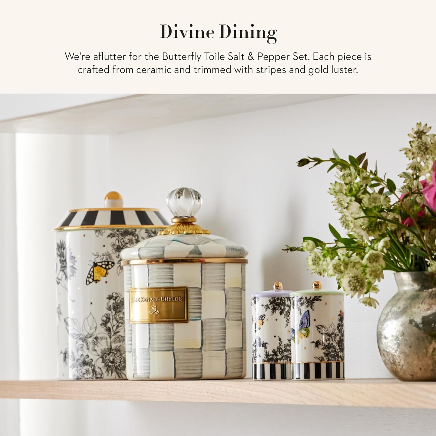 Spice up your table with the MacKenzie-Childs Farmhouse Salt and Pepper Shaker Set, which complements any kitchen decor. Each salt and pepper jar is a work of art that is as functional as it is fashionable. Make sure your seasoning supply is up to snuff because demand will surely be high when calls to “pass the salt and pepper, please” result in the delivery of such flavorful pieces.These cute decorative pepper and salt shakers add a special pinch of style to a family dinner or holiday feast. The decorative design features our signature pattern to add a pretty spin to everyday utensils. These shakers are great for mixing or matching with the other kitchen tools and dishware in our collections, including tea kettles, pitchers, bowls, plates, and more!You’ll never have to guess what to get for a housewarming gift now that you’re a part of the MacKenzie-Childs family. Our artisan-designed home decor is the perfect gift for any special person in your life. Since 1983, our talented designers and artisans have created beautiful original tableware, furniture, home and garden accessories, and more that add joy and grace to homes great and small throughout the world.Care instructions: Hand-wash only. Material: Ceramic. Pieces may vary due to the handmade nature of each product. Imported.