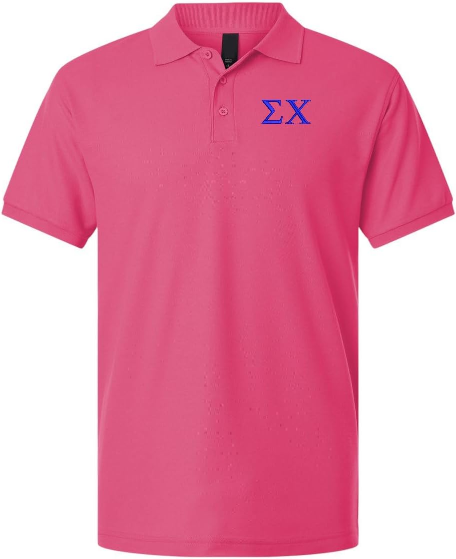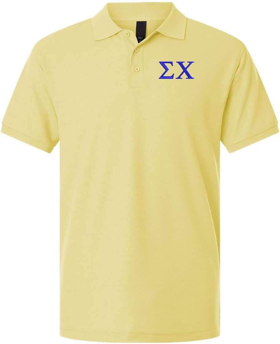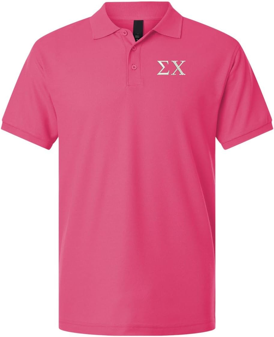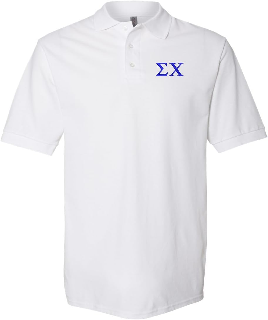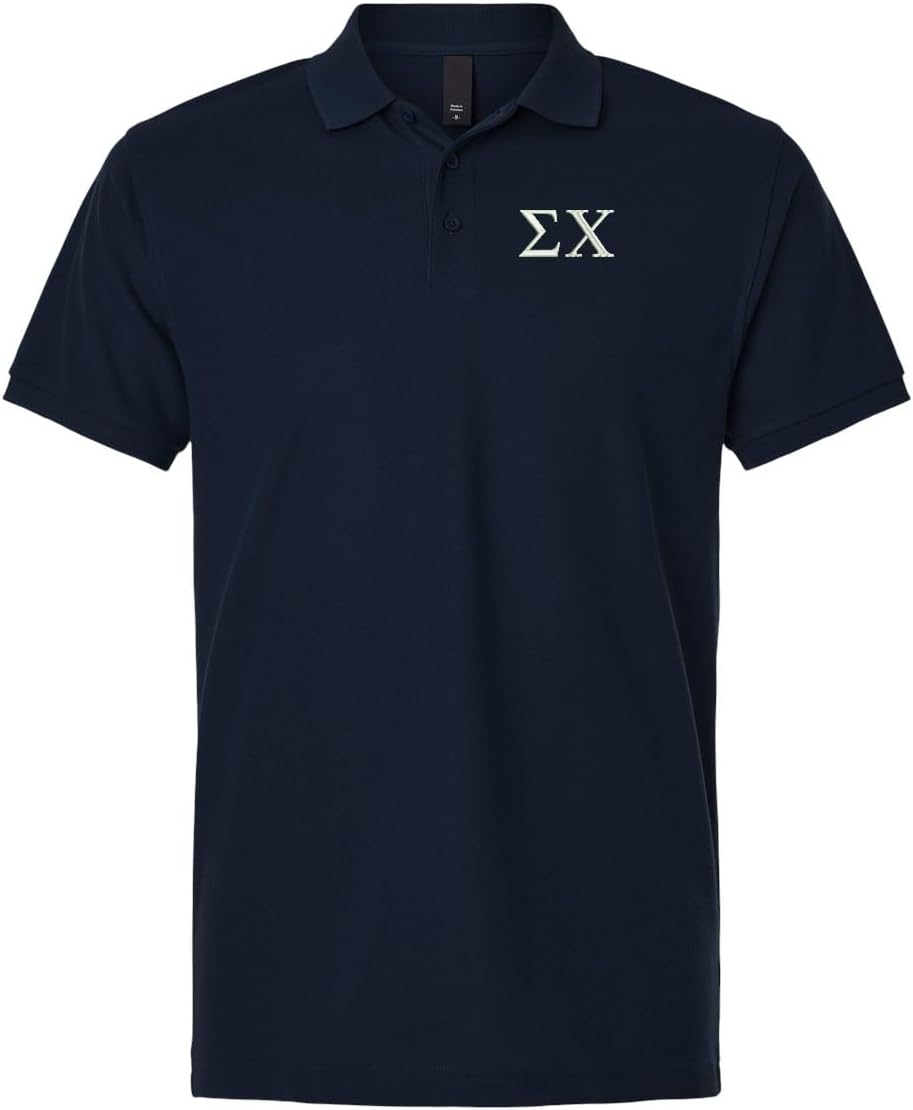 Our pique polo is great fitting and comfortable. Preshrunk pique fabric that is easy to care for and holds its color after many washings. Embroidered Sigma Chi greek letters are approximately 1-1/2 inches tall