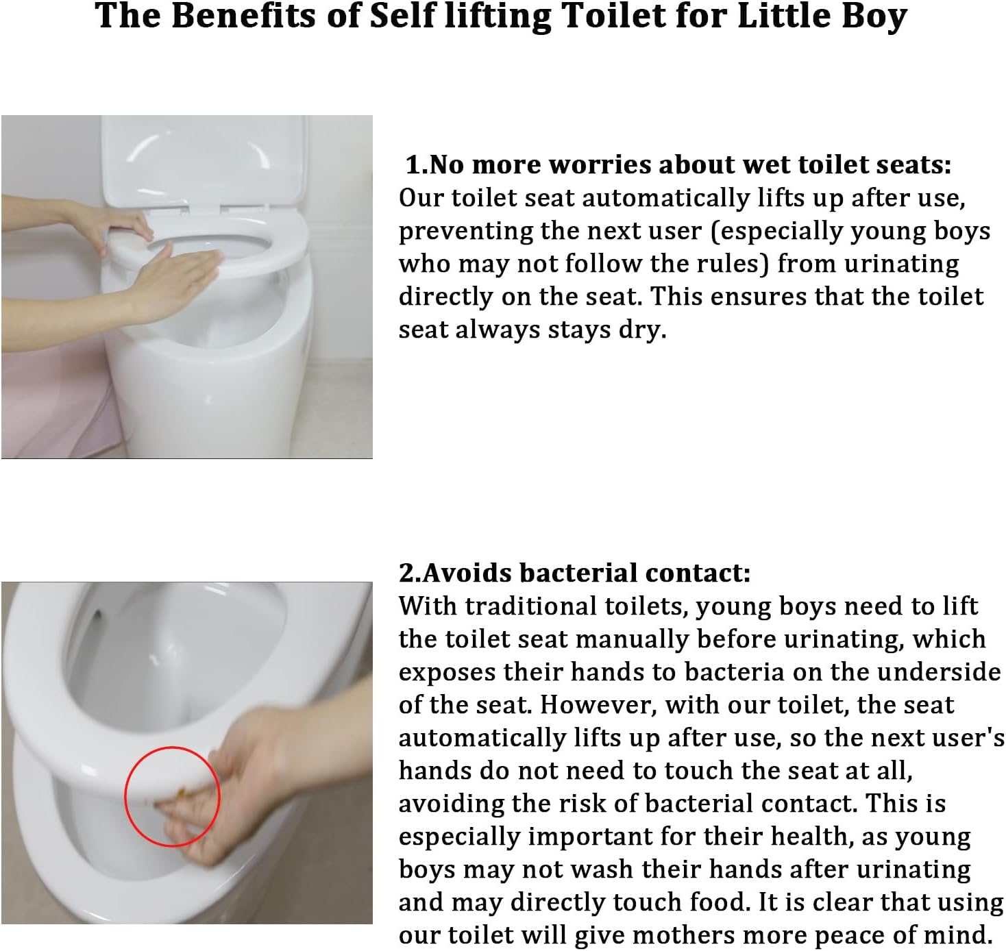 ✅Self Lifting Toilet Seat Cover(Non-Electric) - Transformative Hygiene Solution for Homes and Public SpacesExperience the unmatched value of our Self Lifting Toilet Seat. This touch-free, hygiene-enhancing solution transcends monetary value. It’s not just a product, it’s an investment in a cleaner, healthier lifestyle. Our dedicated team is ready to assist you. Choose transformative hygiene with our Self Lifting Toilet Seat. ✅Description: Elevate your bathroom experience with our state-of-the-art Self Lifting Toilet Seat Cover(Non-Electric), thoughtfully engineered to offer a superior, more sanitary, and convenient usage in both private residences and public facilities including offices, schools, and hospitals. ✅Pre-Purchase Notice: 1.Easy Installation: The installation process for our Self Lifting Toilet Seat is as straightforward as a standard toilet seat. We have provided a detailed installation video on our product page for your reference. Once installed, the seat will be securely fastened. 2.Long-lasting Lift Mechanism: Our toilet seat is designed to withstand frequent use. The automatic lift mechanism is tested to function for at least 50,000 lifts. For optimal longevity, we recommend following the usage instructions provided with the product and on the product page. ✅Key Features: 1.Enhanced Hygiene & User-Friendly: Our Self Lifting Toilet Seat raises automatically, effectively avoiding the possibility of toilet seat contamination from urine splashes especially from male users and little boys, and water droplets during handwashing or brushing. Bid adieu to unsanitary conditions and upgrade your bathroom ambiance, a crucial enhancement in public facilities with high-frequency use. 2.Enhanced Cleanliness & Resource Efficiency: Our Self Lifting Toilet Seat operates through a mechanical mechanism, completely obviating the need for electricity, batteries, or sensors. Its auto-lifting feature aids in sustaining long-term sanitary conditions, considerably alleviating the task of frequent toilet seat cleaning, particularly in households with males prone to urinating without lifting the seat, homes with young boys, or in high-frequency restroom facilities. Our data indicates that this toilet seat generally necessitates cleaning only once every few months. Furthermore, by curtailing the requirement for regular cleaning, our toilet seat aids in the conservation of key resources such as toilet paper and water. Adopt an environmentally sustainable and cost-effective solution that reduces maintenance efforts, time, and costs for both your home or public establishment. 3.Versatile Applications: Our Self Lifting Toilet Seat is innovatively designed to operate without any requirement for power, batteries, or sensors, seamlessly integrating into both home and public settings. Its user-friendly design makes it an ideal choice for offices, schools, hospitals, and other establishments, catering to a diverse range of users who prioritize hygiene and comfort in their restroom experience. 4.Premium Construction: Our toilet seat is crafted from high-grade, sturdy ABS material and solid copper pillars, ensuring its durability. This robust construction guarantees prolonged usage, standing up to the demands of high-traffic public spaces as well as home environments. 5.Superior to Soft Close Toilet Seats: While soft close toilet seats excel in reducing noise during lowering, they remain susceptible to contamination from urine splashes, particularly from male users and young boys. Furthermore, the manual lifting requirement presents potential cross-contamination risks. In contrast, our Self Lifting Toilet Seat elevates automatically, maintaining the seat and lid in a cleaner state, fostering a more sanitary environment for users in both domestic and public settings. 6. Superior to Disposable toilet seat covers: Self Lifting Toilet Seat stands out with its innovation that eliminates the need for frequent seat cover replacements, thereby substantially easing the maintenance workload, and saving on costs associated with long-term replenishment of disposable covers. It operates entirely without electricity, offering a safer choice in bathroom amenities while simultaneously economizing on energy consumption. This unique, mechanical, and self-operating feature makes it a cost-efficient, safe, and labor-saving solution for improved bathroom hygiene.7.Compatibility: Our Self Lifting Toilet Seat is thoughtfully designed to accommodate U-shape or V-shape toilet with dimensions ranging from 17.3 to 18.5 inches. 8. Product Upgrade, Adjustable Seat Lifting Speed: The product has been recently upgraded again, now offering an adjustable seat lifting speed. To adjust the speed, first remove the toilet seat. If you need to increase the lifting speed, pull out the knob on the right and rotate it clockwise. If you need to decrease the lifting speed, pull out the knob on the right and rotate it counterclockwise. Usually, only minor adjustments are needed. If there are any changes in the speed in the future, you can easily adjust it back. It is recommended that the lifting speed does not need to be too fast.✅In Summary:Experience the effortless operation of our non-electric, Self lifting toilet seat. Rooted in robust mechanical principles, this safe and convenient design requires no strenuous efforts, no power supply, and no battery. Choose our toilet seat and embrace a worry-free, efficient, and eco-friendly bathroom solution. Order now to transform your bathroom experience!