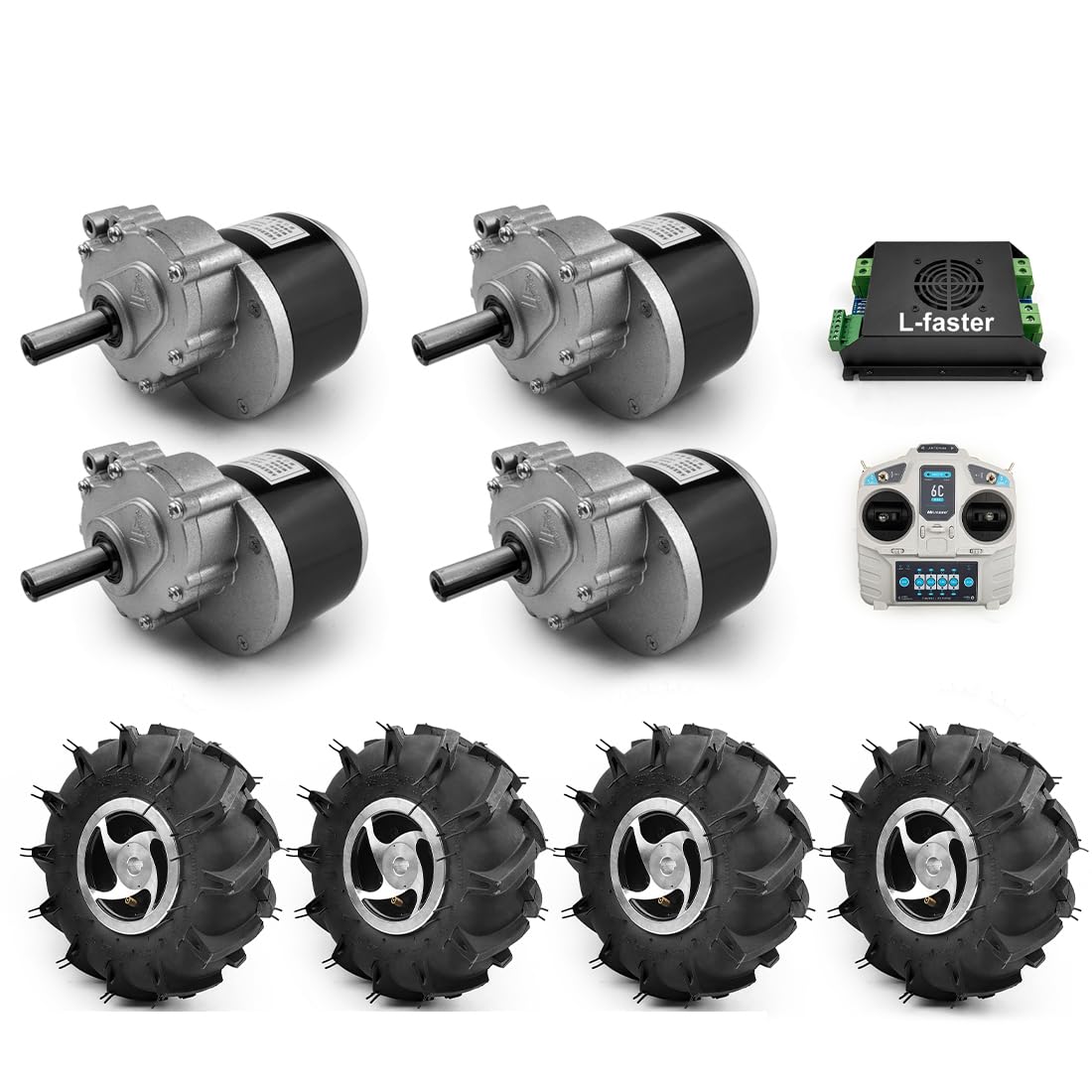 Motor Conversion Kit for Orchard Garden, LawnMower Cart, DIY 4WD, 10in Wheel, Farm Tools, 1000W( ESC Big)This item is a 4WD motor kit.Before order(important):1). This kit is for the 4-wheel drive cart, people can convert the normal cart to an electric cart, this can carry 400kg.----------2). The wheel is 10 inch, it uses a pneumatic tire that is with the inner tube.----------3). This kit's total power is 1000W (the motor is a 250W brushed motor each), there are 2 speed options, please choose the correct speed you need, thanks.----------4). The kit with a 4WD controller ,it can control the motors to run forward, backward, turn left, right, and cruise.----------This item includes:1). 4x 24V250W brushed geared motor2). 4x 10-inch wheel3). 1x 4WD controller ------------------------------Model: MY1016Z-WVoltage: 24 V DCOutput: 250 WattType: Brushed gear reductionOutput speed: 120 Rpm / 75 RpmShaft: diameter 17mm, length 44mmNet weight: 2.8 KG