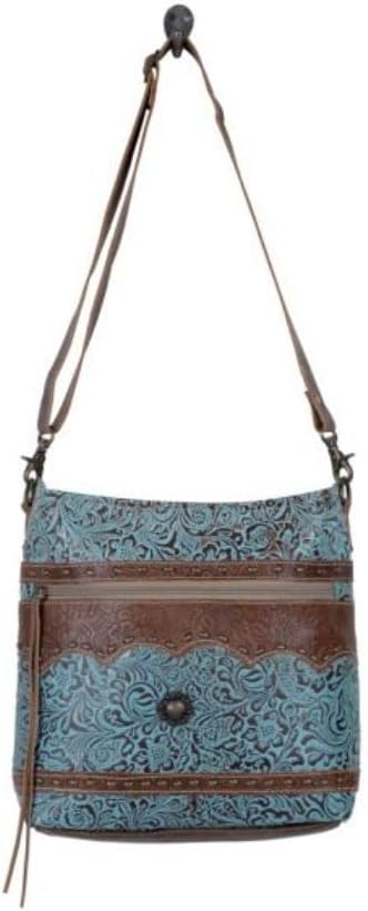 An elegant bag with a regal quality designed with embossed leather and southwest hardware. The front and rear panel offers zippered closure to ensure safe storage.