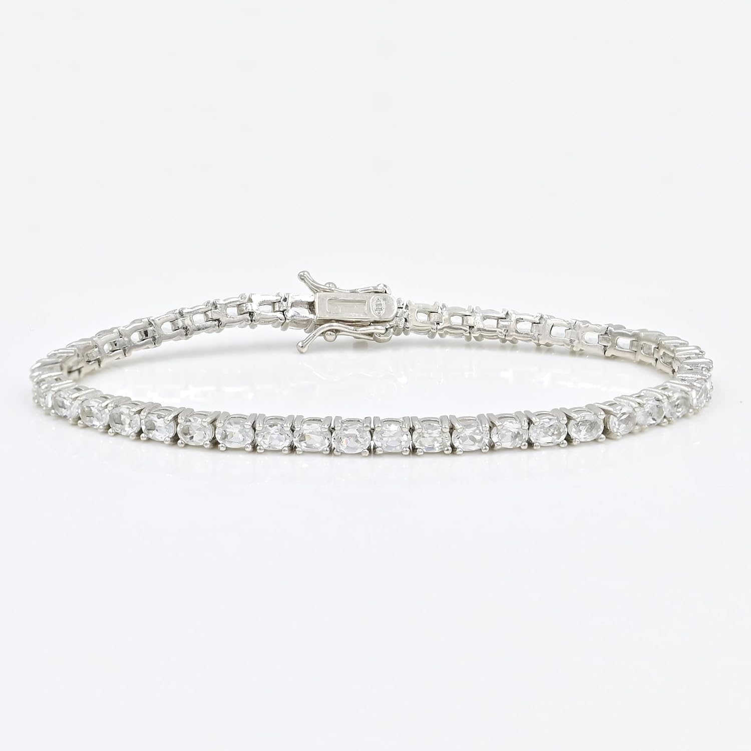 Add timeless sparkle to your collection with this Natural White Topaz Tennis Bracelet (SKU WB-130), handcrafted in genuine 925 Sterling Silver. Each bracelet features a continuous line of natural 4x3mm oval-cut White Topaz gemstones totaling 8.20 carats, offering unmatched brilliance and clarity. The bracelet’s rhodium-plated silver finish enhances its durability and shine, ensuring it remains as bright as your first wear. Designed with a secure box clasp and safety latch, it balances comfort and elegance — perfect for any occasion, from formal evenings to everyday chic. Celebrate April birthdays or simply elevate your jewelry collection with this sophisticated piece — a symbol of purity, brilliance, and timeless grace. Product Details: SKU: WB-130 Gemstone: Natural White Topaz Gemstone Size & Cut: 4x3mm Oval Cut Total Gemstone Weight: 8.20 Carats Metal Type: 925 Sterling Silver (Rhodium Plated) Bracelet Weight: 11.58 Grams Length: 6” to 8.5” (Adjustable or Selectable) Clasp Type: Box Clasp with Double Safety Catch Design: Classic Line Tennis Bracelet Birthstone Month: April