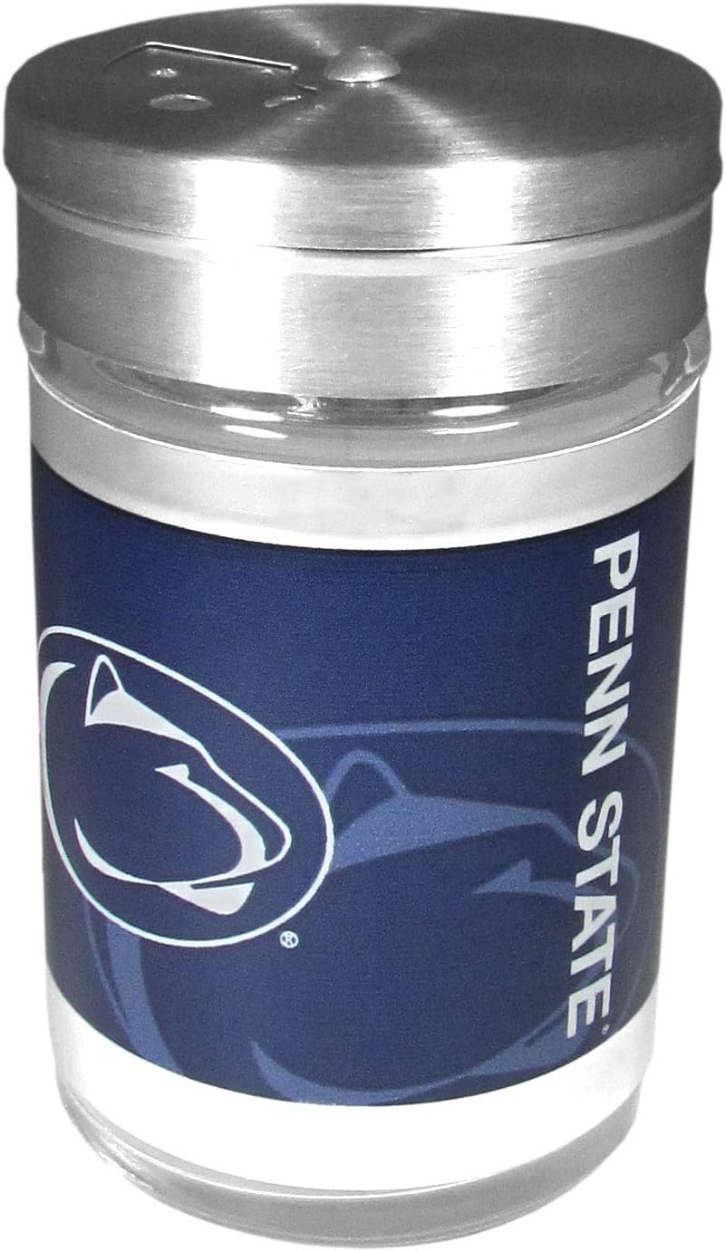 This stainless steel 2pc BBQ grill set is a tailgater's best friend. The colorful and large team graphics on each of the barbecue tools let's everyone know you are a fan! The set in includes a spatula and tongs with the Penn St. Nittany Lions logo. The tool set comes with a compact shaker is 2 inch tall with a twist top that closes off the holes at the top making it perfect for travel preventing those messy spills. The shaker has wide holes perfect for keeping your pepper seeds or cheese toppings.