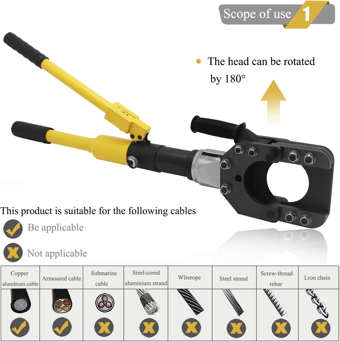 Product Description 1.The blades are manufactured from high strength special steel, heat treated (HRC-60℃) to ensure a long service life. 2.The head can be easily opened to allow the cutting of running cables. 3. Suitable for the diameter ≤ 85mm of Copper-aluminium cable and Armoured cable 4. Blades can be replaced. 5. With bolt on the cutting head, can open, and easy to put in and take out the cable. Technical Parameter Model:RZ-85 Cutting power: 10 Ton Cutting range: diameter ≤ 85mm Copper-aluminium cable and Armoured cable Note: Forbidden to cut Steel cable, Steel wire Weight: 12kg If you have any problems, please send emails to contact us.