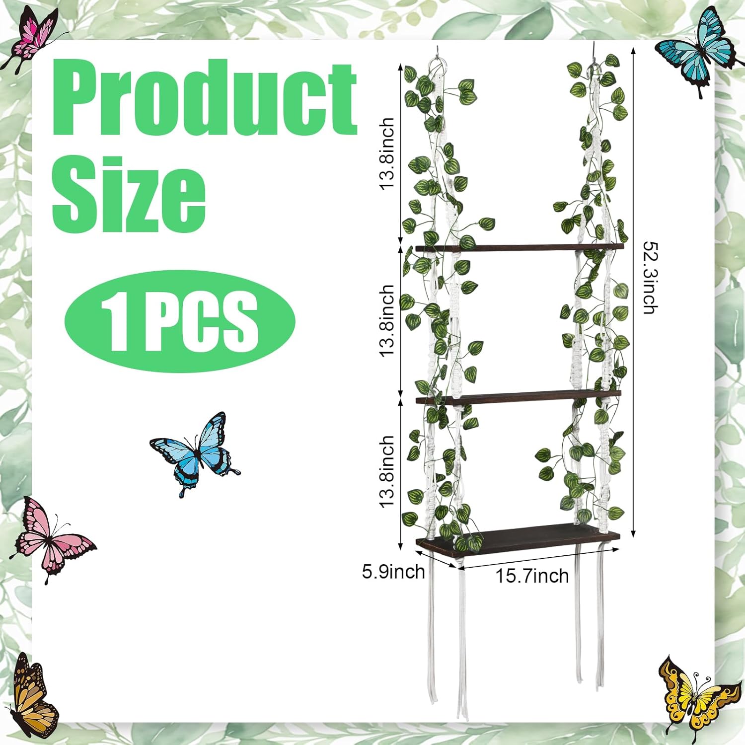 Features: Bohemian Style: The woven rope design of the 3-tier floating shelves exudes a bohemian vibe, while also adding a cottagecore charm. The included butterfly stickers bring a nature-inspired atmosphere, enhancing the overall aesthetic. More Storage Space: The three-tier design increases the storage capacity of the shelf, while the hanging design takes up minimal floor space, helping to keep your room neat and organized. Specifications: Material: wood, plastic Color: brown, green Size: 3 Tier Hanging Shelves: 15.8 x 5.9 x 51.9 inches Package includes: A set of 3-Tier Hanging Shelf 36 Pcs Butterfly Stickers Notes: Manual measurement, please allow slight errors on size. The color may exist a slight difference due to different screen displays. Warning: This product contains magnets. Keep a way from children and pets. If swallowed, seek medical help immediately