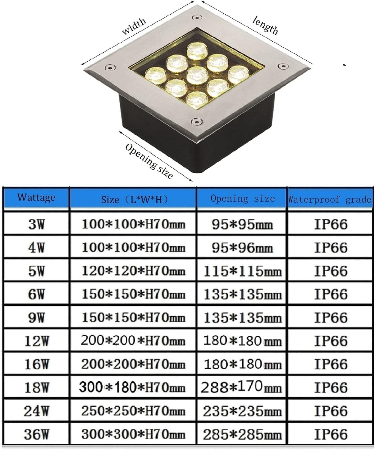 Item Weight:14.1 ouncesDepartment:unisex-adultManufacturer:GhinlifeASIN:B0BRNRD66CCountry of Origin:ChinaImport:Country as LabeledProduct Name: outdoor Recessed Ground Light / Well LightsSpecifications:Material: stainless steel + glass glassLED Wattage: 3W, 4W, 5W, 6W, 9W, 12W, 16W, 18W, 24W, 36WVoltage: AC85-265VLifetime: 50,000hoursWaterproof level: IP66Luminous colors: Blue, Green, Purple, Red, Warm White, White, YellowApplicable places: decoration of squares, buildings, parks, villas, stairs, walls, treesProduct Details:1. The lamp body is made of stainless steel, which has pressure resistance and can withstand wind and rain. The back cover is thickened, and the lengthened sealing design has excellent waterproof performance2. The heat dissipation effect of the lamp is good, and the integrated thick die-casting aluminum radiator + convection design is adopted, which increases the heat dissipation of the lamp and ensures the service life of the lampProduct manual1. The product is waterproof and rainproof, but it is not recommended to use in low water2. This product has passed CIE, IEC, EMC (3C) international implementation standards, so you can use it with confidencePackage include:1* LED Spotlight