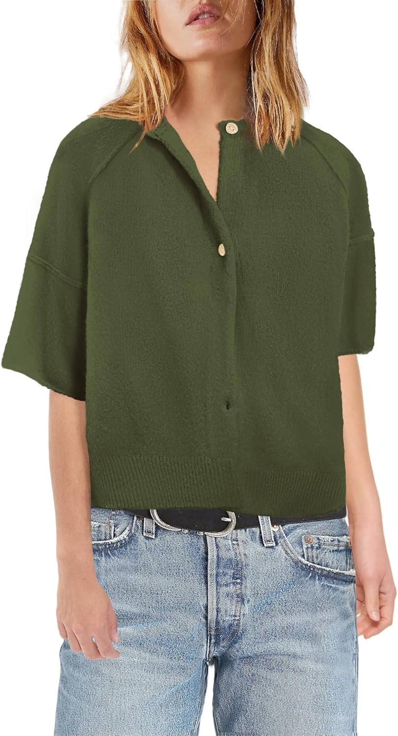 Features:1. This short sleeve cardigan is crafted from a soft and breathable blend knit fabric, making it comfortable for warm weather layering and perfect for daily wear or casual outings.2. Top: classic crew neckline, button up cardigan front, relaxed drop-shoulder sleeves, exposed seam details, ribbed bottom hem, cropped length.3. These cardigan sweaters for women combine lightweight comfort with modern style, making them a versatile wardrobe essential for effortless layering.Question & Answers:Q1: Is this cropped cardigan for women true to size?A1: Yes, this style is designed to fit true to standard US sizing. We recommend ordering your usual size for a relaxed fit. If you prefer a slightly roomier feel, consider sizing up.Q2: Is there any color difference between the actual item and the pictures?A2: Due to differences in monitor settings and lighting, slight color variations may occur. However, the overall shade and knit texture remain consistent with the images shown.Style: daily, casual, relaxed, trendy, minimalistNote: Due to manual measurement, please allow a 1-inch difference in size.How to Wash: Machine wash cold with like colors. Do not bleach. Lay flat or hang to dry to maintain shape and knit quality.