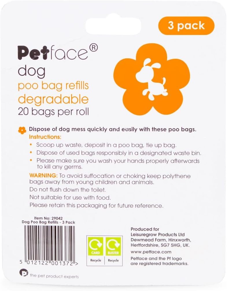 Product Description Petface poop bags are an easy way to help you clean up after your dog when you are out and about. Dog mess can be hazardous and is unpleasant to others. These handy refills fit the Petface Poop Bag Dispenser and will help you to clear up after your dog quickly and easily. Set Contains: 1 x Dog Poop Bag Refills (Pack of 3 rolls, 20 bags per roll, total of 60 bags)