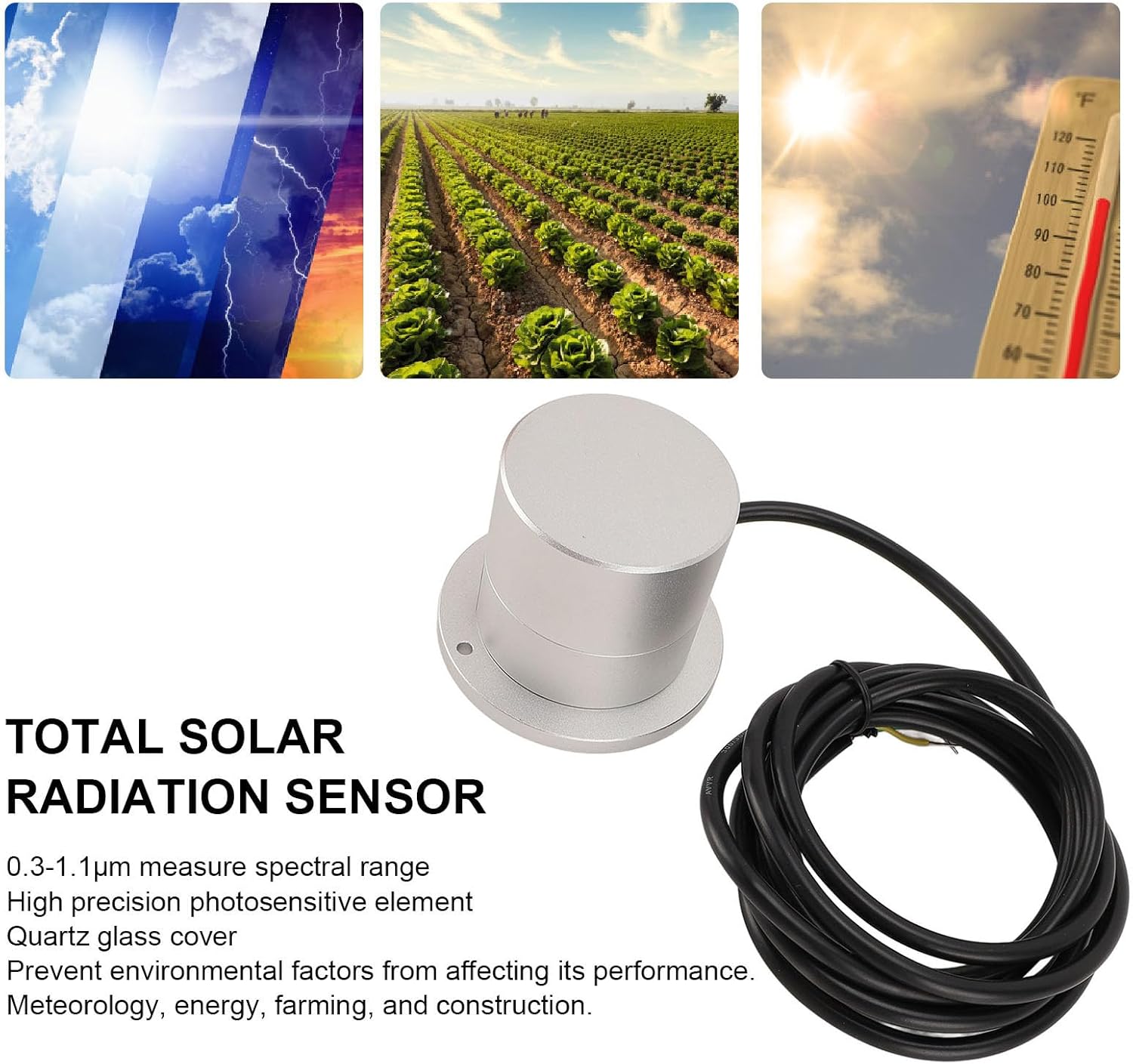 [HIGH PRECISION MEASUREMENT] The solar radiation sensor delivers exceptional accuracy with its high precision photosensitive ensuring reliable measurements of total solar radiation within the 0.3 to 1.1μm spectral range. Its stability and sensitivity (7-14μV/W·㎡) guarantee consistent performance even in varying environmental conditions making it ideal for scientific and industrial applications.[VERSATILE FUNCTIONALITY] This sensor is designed to measure not only total solar radiation but also reflected radiation when the inductive surface is down and scattered radiation with the shading ring. Its broad spectrum range (300-1100nm) and measurement capability (0-1500W/㎡) make it a versatile tool for meteorology energy farming and construction industries.[DURABLE CONSTRUCTION] Built with an aluminum alloy body and a quartz glass cover crafted through precision optical cold working this sensor is both rugged and reliable. The protective cover ensures safe transportation and the instrument from harsh weather conditions while the glass cover minimizes environmental interference.[EASY INTEGRATION] Equipped with Modbus RS485 output and a 9-30V power supply this sensor seamlessly integrates into existing systems. The clear wire color coding (Red Black Yellow Green) simplifies installation and the detailed user manual provides step by step guidance for setup and troubleshooting.[USER FRIENDLY DESIGN] The compact size (65 x 52 x 49mm) and lightweight (298g) design make this sensor easy to install and handle. With a low power consumption (0.48W) and robust operating range (-40℃ to 60℃) it is designed for long term use in diverse environments ensuring reliable performance year after year.Spec:Item Type: Solar Radiation SensorWire Color: Red: Output signal RS485: Power PositiveBlack: Output signal RS485: A+Yellow: Output signal RS485: B-Green: Output signal RS485: Power NegativePower Supply: