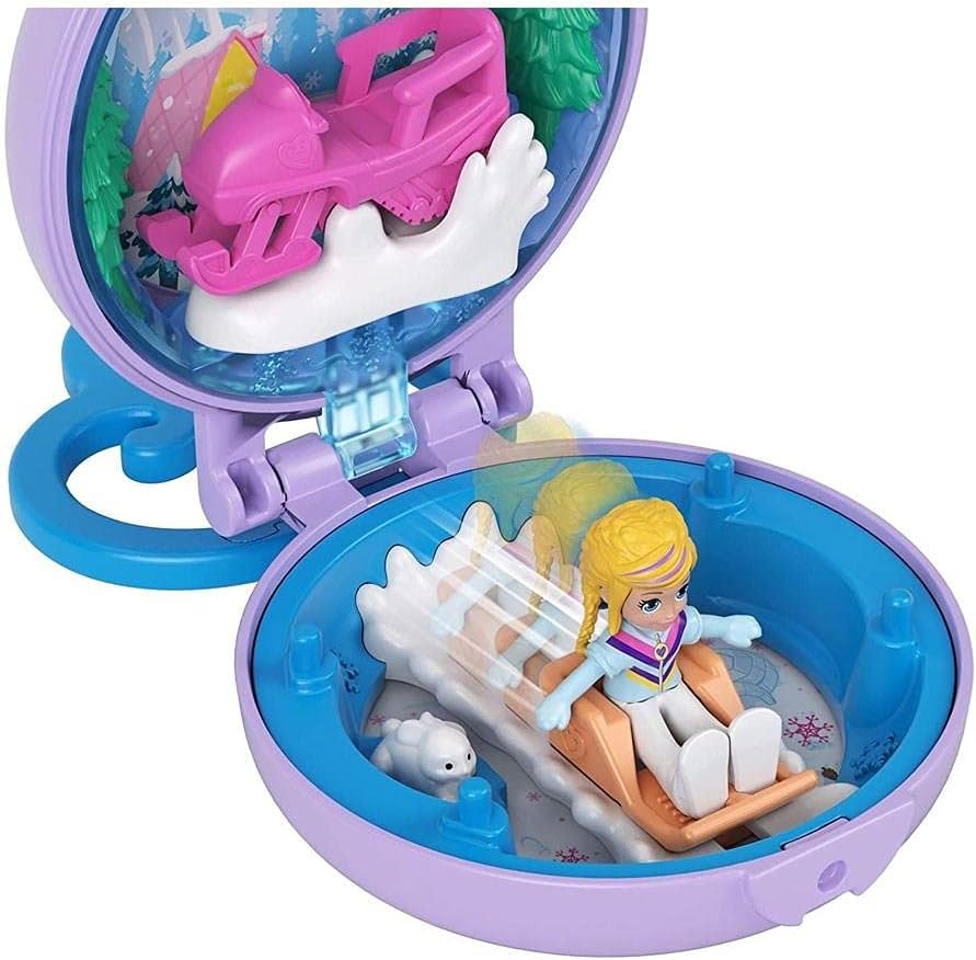 Take this Polly Pocket Polly Snow Cabin compact to go for a fun-filled adventure in the snow! Compact includes micro Polly doll, her removable snowmobile accessory (kids can place it inside or outside of the compact) and her adorable "snow" bunny friend. Polly doll can ride on the snowmobile (it sits on a snow base and teeters back and forth for riding motion); she can ski in the skis that slide back and forth; and she can play in the snow with her adorable bunny friend! Pop open the top frame of the compact to insert a personal photo or scene for added play value! Compact also has a cute heart-shaped ring attached so kids can clip it on backpacks or purses to take On-the-Go for great Polly Pocket adventures, anytime, anywhere! Makes a great gift for ages 4 years old and up especially those who love winter sports, the outdoors and snowy fun! Colors and decorations may vary.