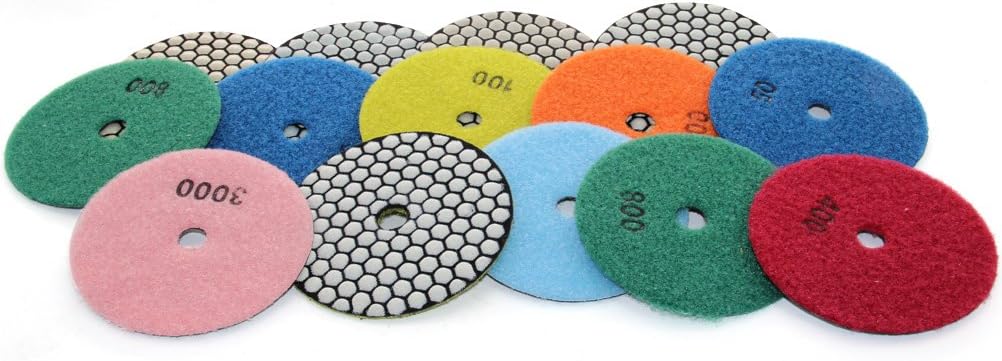 (1)10 Pieces Set (Polishing Pads Grit 50#).(2)4" Dry Premium Quality (Standard AA) Pads for polishing marble and granite.(3)Aggressive and Durable made with Diamond Powder impregnated in Resin.(4)Available Grit: 50#, 100#, 200#, 400#, 800#, 1500#, 3000#, Buff.(5)The pads can be wet or dry use, we recommend DRY use.(6)The diamond polishing pads are aggressive. It is flexible and can polish either contoured surface like Ogee, full bullnose, half bullnose, bevel, demi or flat surface.(7)For Marble, Granite special shaped processing, don't need to add water to cooling, don't staining, low cost, safety and good clarity.