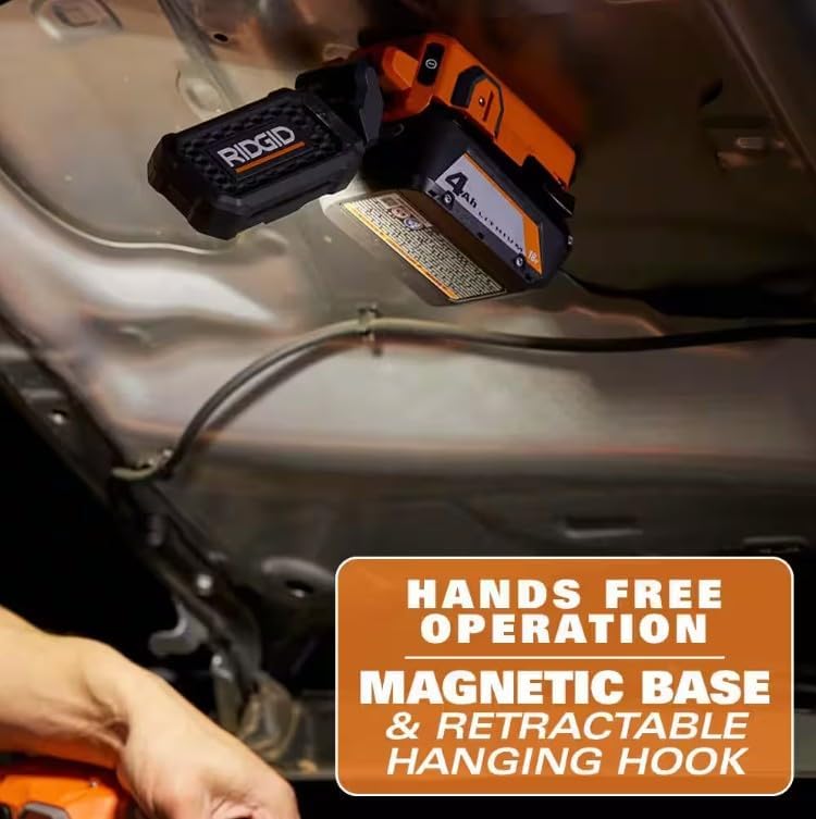 The RIDGID R86901 18V Magnetic LED Task Light (Tool Only) delivers 900 lumens from clear white LEDs to illuminate your task. RIDGID Clear White LEDs consistently provide clear white light providing users visibility of fine details and accurate colors. The magnetic task light features high and low modes with up to 24 hours of runtime on low setting (using an AC840060 18V 6.0Ah MAX Output battery), providing continuous lighting. For optimized user control and versatility, this light head pivots 225° and rotates 270°. For hands free operation, the task light can be hung using the retractable hanging hook, magnetic base, or placed on flat surfaces. As always, this RIDGID 18V Magnetic LED Task Light is 100% compatible with all RIDGID 18V batteries.