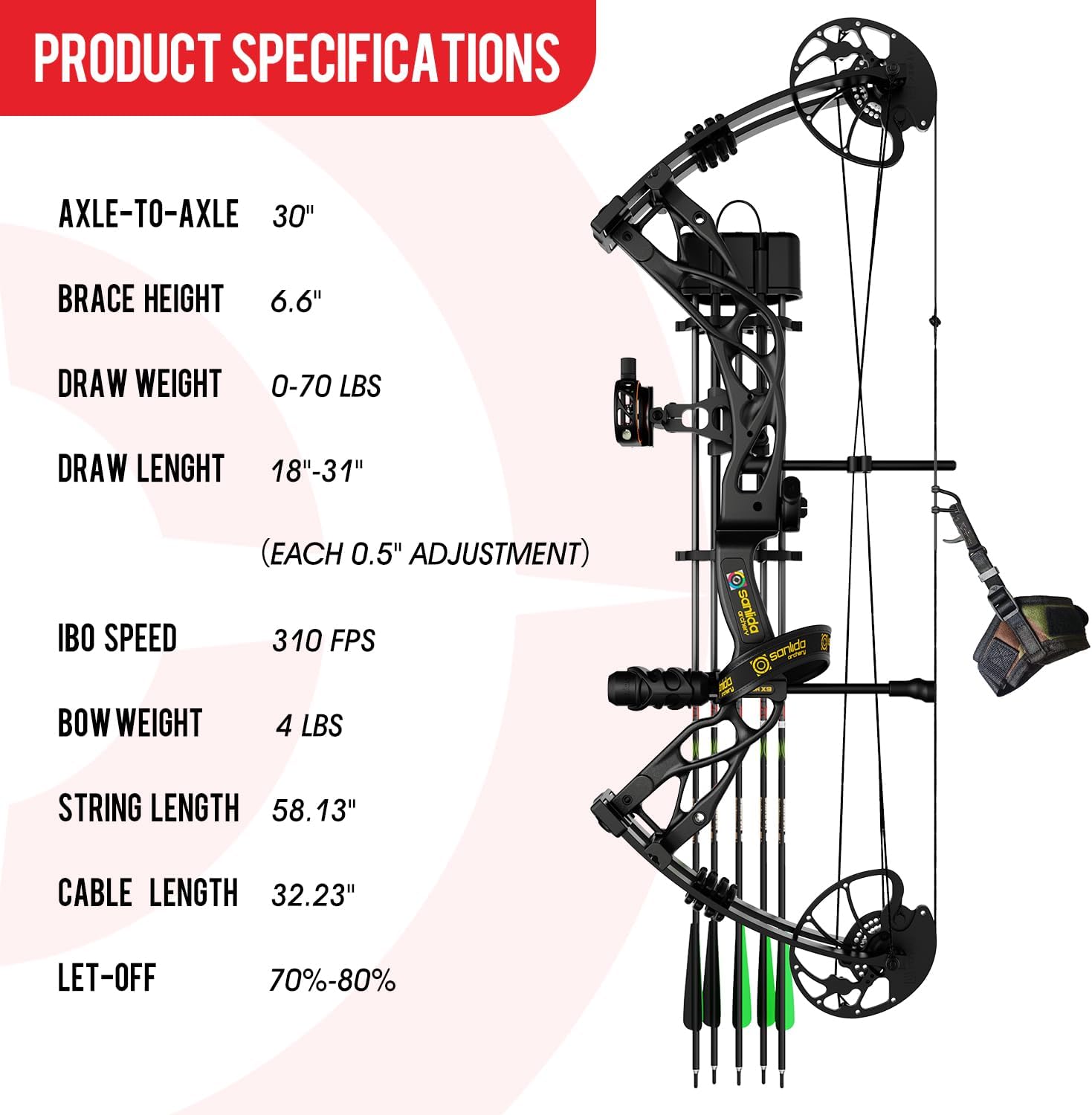 Package 1: Sanlida Dragon X9 compound bow kit Specs:0-70# draw weight, Black Package 2: 24pcs Dragon 9 Pure Carbon Arrows Straightness: +/-.003" 370 Spine