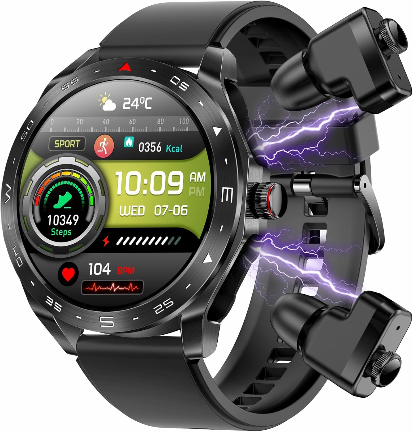 【Smart watch + Bluetooth Ear buds】 Meet the most rugged and capable cnBro SmartWatch ever.Ready for Action. The new Action button gives you quick, physical control over a variety of functions.Everything in its place. An essential and versatile tool that fits on your wrist, cnBro SmartWatch packs incredible capability into a surprisingly small space. ●All New colors ○Black/Silver(Stainless steel strap),Black/Silver(Silicone strap) ●Big screen. Huge impact. ○1.52-inch TFT high-definition full-color screen ●Easy on the eyes. Easy on the fingers. ○Full color, full touch screen ●A brighter view of you. ○360*360 ●It watches over you day and night. ○Automatic sleep data monitoring, historical data can be viewed on the watch or APP ●Hello, your wrist is calling. ○Check notifications with a glance. With Bluetooth connectivity you can do more, even when you don't have your phone ●The most durable cnBro* Smart Watch ever built. ○Crack Resistant/Dust Resistant/Water Resistant ●Charges in no time. ○400+35mAh About 2.5H Charging time and 7~10 days of use, 45 days of standby ●It's the ultimate fitness partner. ○Sports mode (Pedometer, walking, running, football, badminton, tennis, basketball, table tennis, cycling, mountain climbing, rope skipping, yoga etc.) ●Find a face that puts a smile on yours. ○The watch has built-in dials of various styles, and photos can be customized as the dial ●Track your menstrual cycle with a tap. ◎SPECIFICATION: System Requirements:Android 6.0 and above, iOS 10.0 and above, Bluetooth 5.2 support ◎WHAT'S IN THE BOX - 1*Watch - 1*Watch Box - 1*User Manual - 1*Charging line