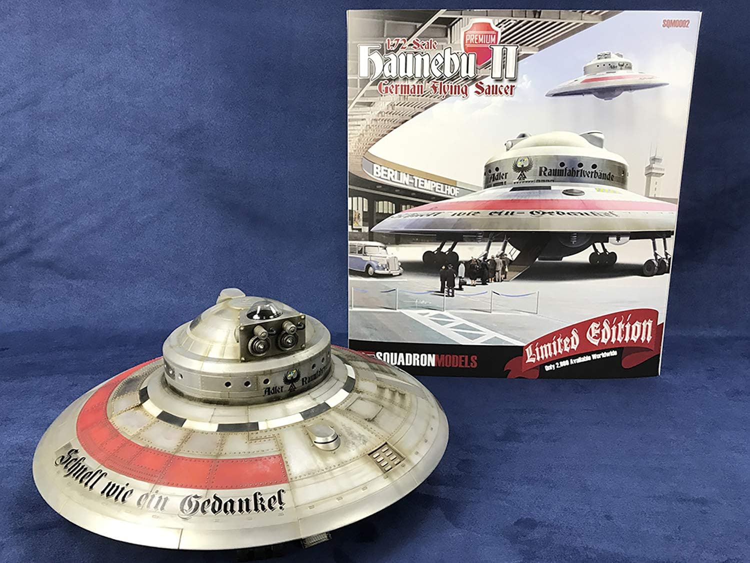 Premium version consists of a resin upgrade set to convert the military version into a civilian platform that includes: very detailed top deck/observation bunker. Rear port, choice of top dome (resin or vacu-form acetate), 12 upgraded wheels, radome disc for main upper body, bottom cover discs (4) to replace kit ball turrets with choice of installing laser units or clear bulbs. Haunebu kit also features beautiful decal markings to represent a civilian space-expeditionary livery. Comes with exquisite Falcon clear vacu-canopies. Also includes: State of the art Instruction Manual with full color profile and painting guide, brief history of the Hannebu II also incorporated into the booklet. Packaged in a deluxe box with protective sleeve including original artwork suitable for framing.