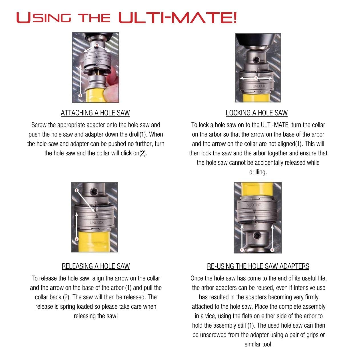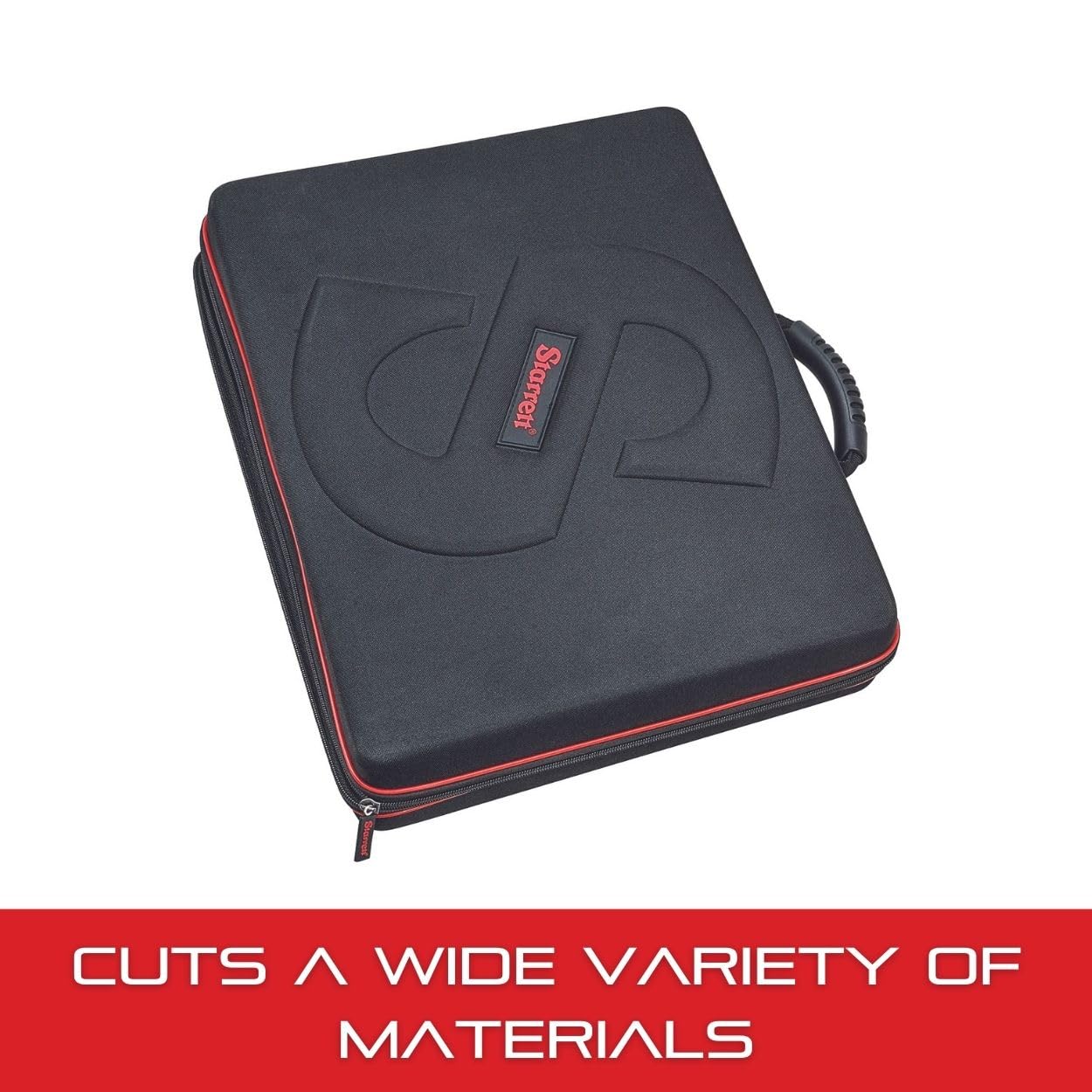 Starrett's Deep Cut Industrial Hole Saw Kit featuring dual pitch hole saws and select accessories. High speed, heat resistant Carbide Steel teeth welded to a durable alloy backing and cap. The saw is exceptionally strong, safe, and shatter resistant. These tools effectively and economically cut a variety of materials including wood, metal, and steel. Kit includes the following: DCH Series 19mm (3/4''), 22mm (7/8''), 29mm (1.1/8''), 35mm (1.3/8''), 38mm (1.1/2''), 44mm (1.3/4''), 51mm (2''), 57mm (2.1/4''), 64mm (2.1/2''), 76mm (3''), 83mm (3.1/4''), 92mm (3.5/8''), 95mm (3.3/4''), 108mm (4.1/4''), 114mm (4.1/2''). A1E Arbor, A4E Arbor, A2E Quick Hitch Arbor, A12 Arbor Adapter, A5 Arbor Extension.