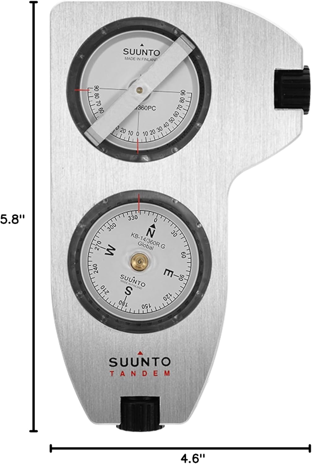 Product Description Used all over the world by antenna installation technicians, surveyors, engineers, miners, architects and many others to measure bearings quickly, reliably and easily. Amazon.com The Suunto Tandem is a liquid-filled precision compass and clinometer that's an invaluable tool for surveyors, engineers, cartographers, geologists, miners, and anyone else who needs to measure directional indications, heights, vertical angles, and slopes with speed and accuracy. The dual-purpose unit--which comes in a water- and impact-resistant aluminum housing--includes scales in both degrees (0 +/- 90 degrees) and percent (0 +/- 150 percent), along with a conversion table (cosines 0 to 45 degrees) and an optical adjustment for reading. The device is particularly handy for surveying and construction projects, as it overcomes obstacles or depressions in the line of vision. And users who need to establish GPS communication or install and position a satellite antenna will love the Tandem, as it helps in establishing the right direction and correct angle and helps ensure that nothing is blocking the satellite signal. Additional features include a high degree of accuracy (the Tandem delivers precise readings in seconds), 90-degree edges for contact measuring, a lanyard, and a convenient carrying pouch with a belt loop. It's also simple to change the Tandem from compass to clinometer--all it takes is a click of the wrist.